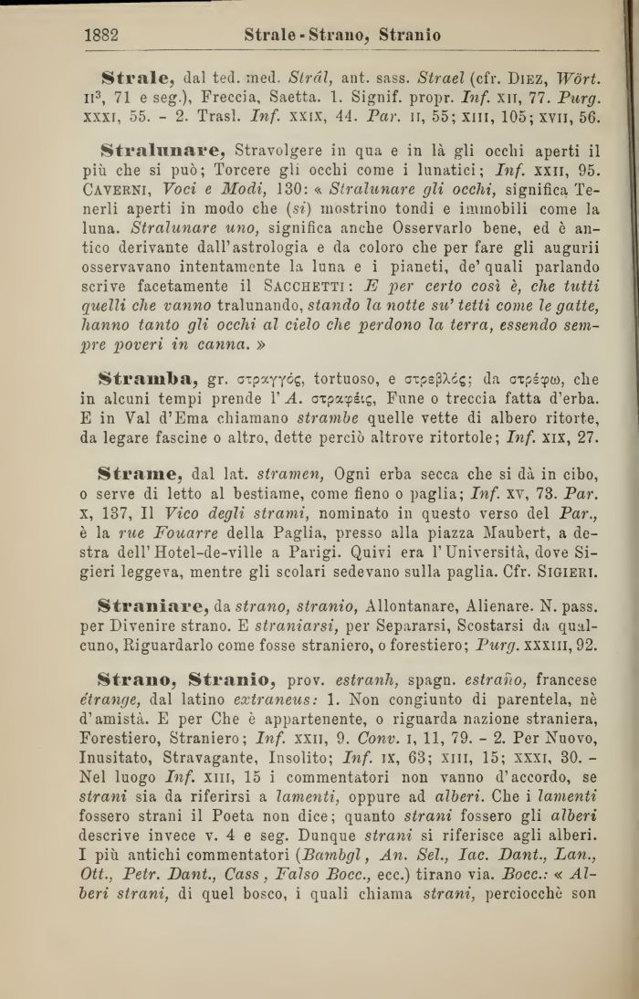 Strano, Stranio, prov. estranh, spagn. estrano, francese étrange, dal latino extraneus: 1. Non congiunto di parentela, nè d'amistà. E per Che è appartenente, o riguarda nazione straniera, Forestiero, Straniero; Inf. xxii, 9. Conv. i, 11, 79. - 2. Per Nuovo, Inusitato, Stravagante, Insolito; Inf. ix, 63; xm, 15; xxxi, 30. -Nel luogo Inf. xm, 15 i commentatori non vanno d'accordo, se strani sia da riferirsi a lamenti, oppure ad alberi. Che i lamenti fossero strani il Poeta non dice; quanto strani fossero gli alberi descrive invece v. 4 e seg. Dunque strani si riferisce agli alberi.