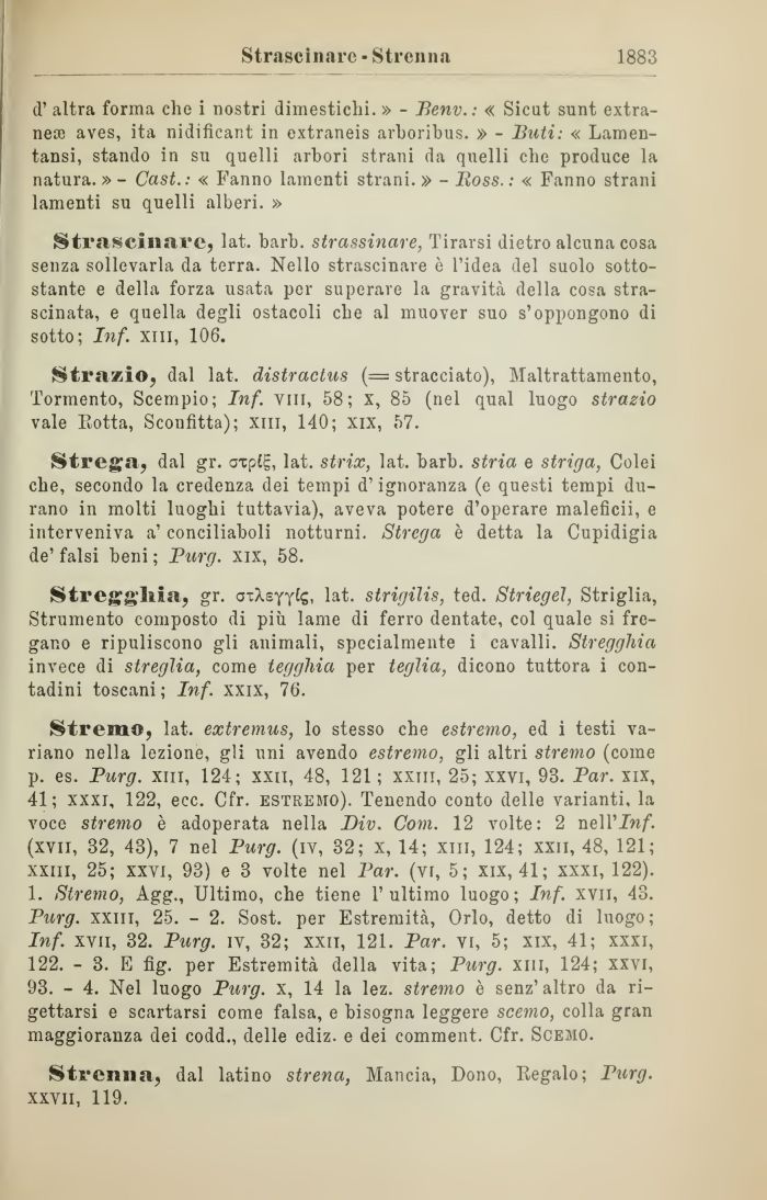 Stremo, lat. extremus, lo stesso che estremo, ed i testi variano nella lezione, gli uni avendo estremo, gli altri stremo (come p. es. Purg. xm, 124; xxn, 48, 121; xxm, 25; xxvi, 93. Par. xix, 41; xxxi, 122, ecc. Cfr. estremo). Tenendo conto delle varianti, la voce stremo è adoperata nella Div. Com. 12 volte: 2 nelVInf. (xvii, 32, 43), 7 nel Purg. (iv, 32; x, 14; xm, 124; xxn, 48, 121; xxm, 25; xxvi, 93) e 3 volte nel Par. (vr, 5; xix, 41; xxxi, 122). 1. Stremo, Agg., Ultimo, che tiene l'ultimo luogo; Inf. xvii, 43. Purg. xxm, 25. - 2. Sost. per Estremità, Orlo, detto di luogo; Inf. xvii, 32. Purg. iv, 32; xxii, 121. Par. vi, 5; xix, 41; xxxi, 122. - 3. E fig. per Estremità della vita; Purg. xm, 124; xxvi, 93. - 4. Nel luogo Purg. x, 14 la lez. stremo è senz' altro da rigettarsi e scartarsi come falsa, e bisogna leggere scemo, colla gran maggioranza dei codd., delle ediz. e dei comment. Cfr. Scemo.