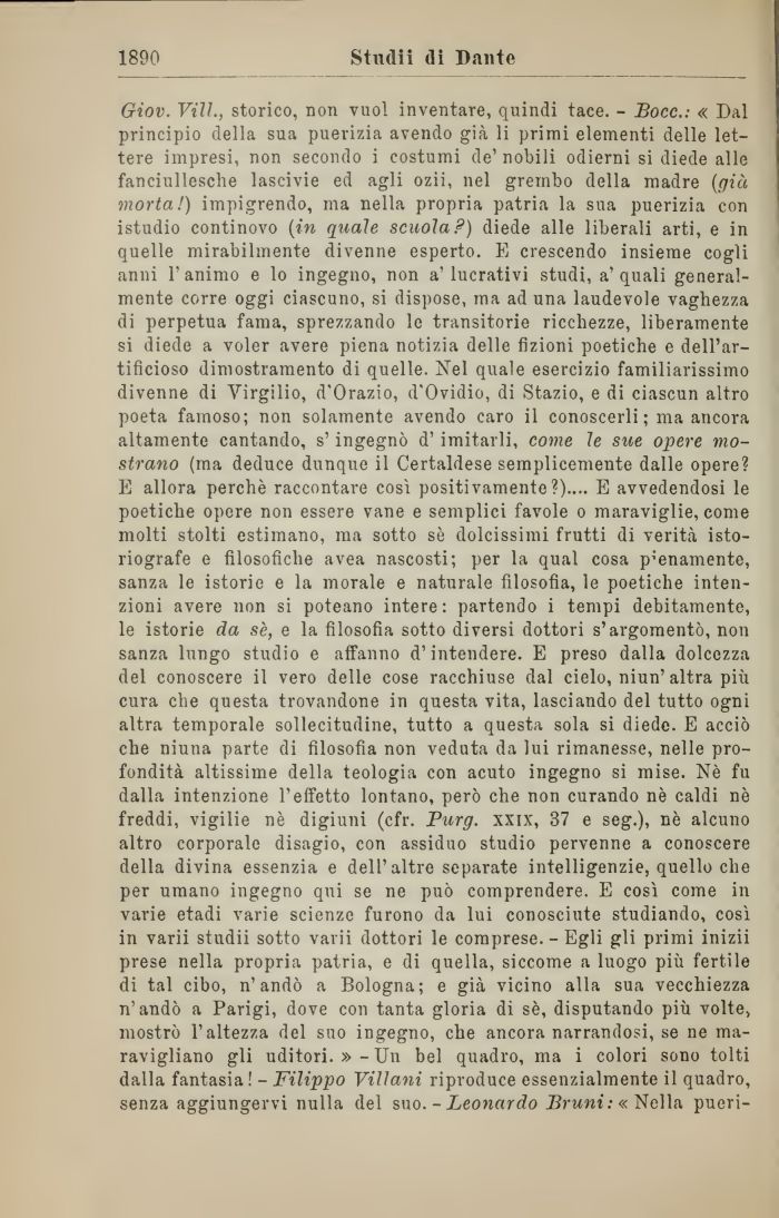Giov. Vili., storico, non vuol inventare, quindi tace. - Bocc.: « Dal principio della sua puerizia avendo già li primi elementi delle lettere impresi, non secondo i costumi de' nobili odierni si diede alle fanciullesche lascivie ed agli ozii, nel grembo della madre (già morta!) impigrendo, ma nella propria patria la sua puerizia con istudio continovo (in quale scuola ?) diede alle liberali arti, e in quelle mirabilmente divenne esperto. E crescendo insieme cogli anni 1' animo e lo ingegno, non a' lucrativi studi, a' quali generalmente corre oggi ciascuno, si dispose, ma ad una laudevole vaghezza di perpetua fama, sprezzando le transitorie ricchezze, liberamente si diede a voler avere piena notizia delle Azioni poetiche e dell'artificioso dimostramelo di quelle. Nel quale esercizio familiarissimo divenne di Virgilio, d'Orazio, d'Ovidio, di Stazio, e di ciascun altro poeta famoso; non solamente avendo caro il conoscerli ; ma ancora altamente cantando, s'ingegnò d' imitarli, come le sue opere mostrano (ma deduce dunque il Certaldese semplicemente dalle opere? E allora perchè raccontare così positivamente?).... E avvedendosi le poetiche opere non essere vane e semplici favole o maraviglie, come molti stolti estimano, ma sotto sè dolcissimi frutti di verità isto-riografe e filosofiche avea nascosti; per la qual cosa pienamente, sanza le istorie e la morale e naturale filosofia, le poetiche intenzioni avere non si poteano intere: partendo i tempi debitamente, le istorie da sè, e la filosofia sotto diversi dottori s'argomentò, non sanza lungo studio e affanno d'intendere. E preso dalla dolcezza del conoscere il vero delle cose racchiuse dal cielo, niun'altra più cura che questa trovandone in questa vita, lasciando del tutto ogni altra temporale sollecitudine, tutto a questa sola si diede. E acciò che niuna parte di filosofia non veduta da lui rimanesse, nelle profondità altissime della teologia con acuto ingegno si mise. Nè fu dalla intenzione l'effetto lontano, però che non curando nè caldi nè freddi, vigilie nè digiuni (cfr. Purg. xxix, 37 e seg.), nè alcuno altro corporale disagio, con assiduo studio pervenne a conoscere della divina essenzia e dell'altre separate intelligenzie, quello che per umano ingegno qui se ne può comprendere. E così come in varie etadi varie scienze furono da lui conosciute studiando, così in varii studii sotto varii dottori le comprese. - Egli gli primi inizii prese nella propria patria, e di quella, siccome a luogo più fertile di tal cibo, n'andò a Bologna; e già vicino alla sua vecchiezza n'andò a Parigi, dove con tanta gloria di sè, disputando più volte, mostrò l'altezza del suo ingegno, che ancora narrandosi, se ne maravigliano gli uditori. »-Un bel quadro, ma i colori sono tolti dalla fantasia ! - Filippo Villani riproduce essenzialmente il quadro, senza aggiungervi nulla del suo. - Leonardo Bruni: « Nella pueri-