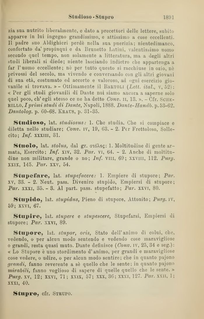 Stupore, lat. stupor, oris, Stato dell'animo di colui, che, vedendo, o per alcun modo sentendo e vedendo cose maravigliose o grandi, resta quasi muto. Dante definisce (Conv. iv, 25, 34 e seg.): « Lo Stupore è uno stordimento d'animo, per grandi e maravigliose cose vedere, o udire, o per alcun modo sentire; che in quanto pajono grandi, fanno reverente a sè quello che le sente; in quanto pajono mirabili, fanno voglioso di sapere di quelle quello che le sente. » Purg. xv, 12; xxvi, 71 ; xxix, 57; xxx, 36; xxxi, 127. Par. xxn, 1; xxxi, 40.