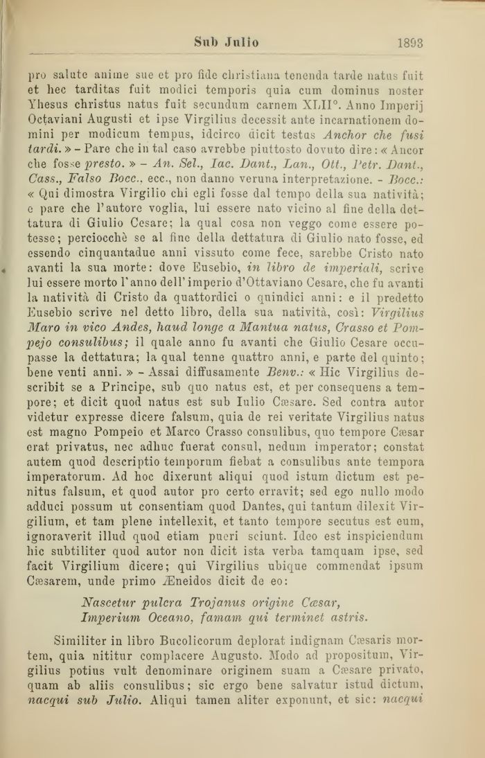 prò salate anime sue et prò fide Christiana tenenda tarde natus fuit et hec tarditas fuit modici temporis quia cum dominus noster Yhesus christus natus fuit secundum carnem XLII0. Anno Imperij Octaviani Augusti et ipse Virgilius decessit ante incarnationem domini per modicum tempus, idcirco dicit testus Anchor che fusi tardi. » - Pare che in tal caso avrebbe piuttosto dovuto dire : « Ancor che fosse presto. » - An. Sei., Iac. Dant., Lan., Ott., J'etr. Dant., Cass., Falso Bocc., ecc., non danno veruna interpretazione. - Bocc.: « Qui dimostra Virgilio chi egli fosse dal tempo della sua natività; e pare che l'autore voglia, lui essere nato vicino al fine della dettatura di Giulio Cesare; la qual cosa non veggo come essere potesse; perciocché se al fine della dettatura di Giulio nato fosse, ed essendo cinquantadue anni vissuto come fece, sarebbe Cristo nato avanti la sua morte: dove Eusebio, in libro de imperiali, scrive lui essere morto l'anno dell'imperio d'Ottaviano Cesare, che fu avanti la natività di Cristo da quattordici o quindici anni : e il predetto Eusebio scrive nel detto libro, della sua natività, così: Virgilius Maro in vico Andes, haud longe a Mantua natus, Grasso et Pom-pejo consulibus; il quale anno fu avanti che Giulio Cesare occupasse la dettatura; la qual tenne quattro anni, e parte del quinto; bene venti anni. » - Assai diffusamente Benv.: « Hic Virgilius de-scribit se a Principe, sub quo natus est, et per consequens a tempore; et dicit quod natus est sub Iulio Cfesare. Sed contra autor videtur expresse dicere falsum, quia de rei ventate Virgilius natus est magno Pompeio et Marco Crasso consulibus, quo tempore Caìsar erat privatus, nec adhuc fuerat consul, nedum imperator; constat autem quod descriptio teinporum fiebat a consulibus ante tempora imperatorum. Ad hoc dixerunt aliqui quod istum dictum est pe-nitus falsum, et quod autor prò certo erravit; sed ego nullo modo adduci possum ut consentiam quod Dantes, qui tantum dilexit Vir-gilium, et tam piene intellexit, et tanto tempore secutus est eum, ignoraverit illud quod etiam pueri sciunt. Ideo est inspiciendum liic subtiliter quod autor non dicit ista verba tamquam ipse, sed facit Virgilium dicere; qui Virgilius ubique commendat ipsum Csesarem, unde primo JEneidos dicit de eo: