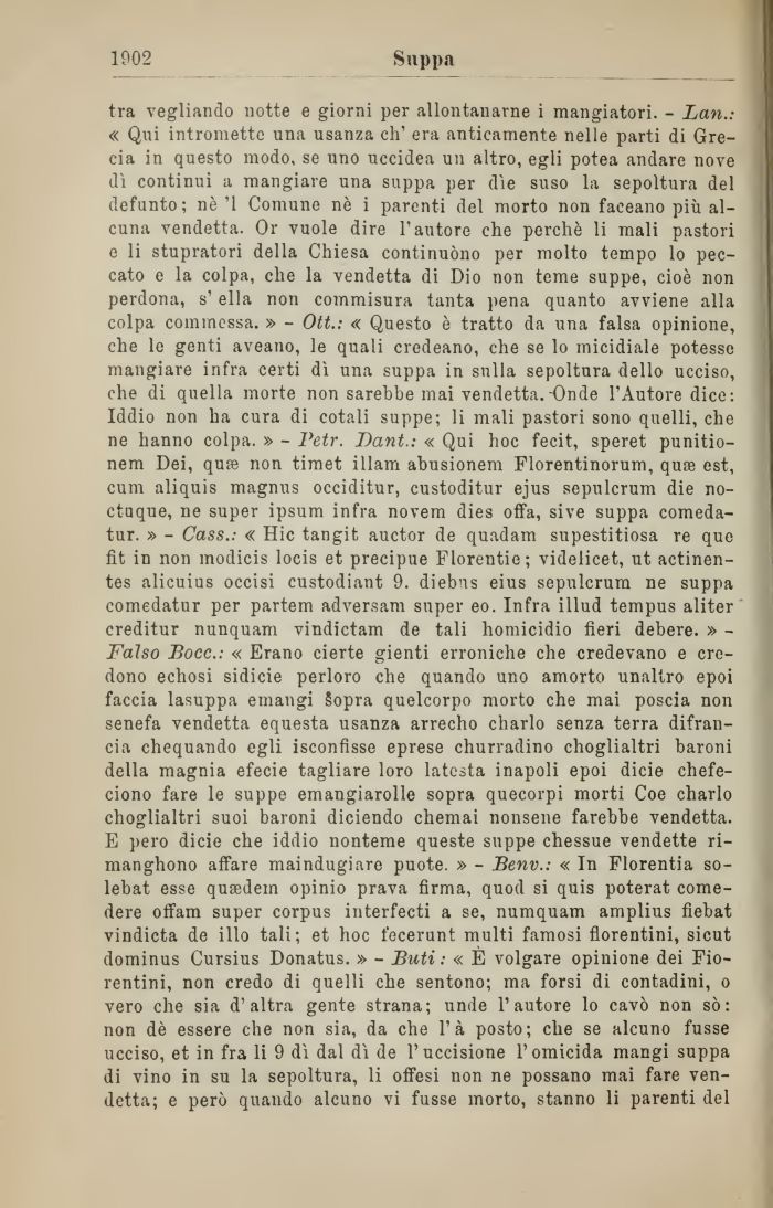 tra vegliando notte e giorni per allontanarne i mangiatori. - Lan.: « Qui intromette una usanza eh' era anticamente nelle parti di Grecia in questo modo, se uno uccidea un altro, egli potea andare nove dì continui a mangiare una suppa per die suso la sepoltura del defunto; nè '1 Comune nè i parenti del morto non faceano più alcuna vendetta. Or vuole dire l'autore che perchè li mali pastori e li stupratori della Chiesa continuòno per molto tempo lo peccato e la colpa, che la vendetta di Dio non teme suppe, cioè non perdona, s' ella non commisura tanta pena quanto avviene alla colpa commossa. » - Ott.: « Questo è tratto da una falsa opinione, che le genti aveano, le quali credeano, che se lo micidiale potesse mangiare infra certi dì una suppa in sulla sepoltura dello ucciso, che di quella morte non sarebbe mai vendetta.-Onde l'Autore dice: Iddio non ha cura di cotali suppe; li mali pastori sono quelli, che ne hanno colpa. » - Petr. Dant.: « Qui hoc fecit, speret punitio-nem Dei, qure non timet illam abusionem Florentinorum, quae est, cum aliquis magnus occiditur, custoditur ejus sepulcrum die no-ctuque, ne super ipsum infra novem dies offa, sive suppa comeda-tur. » - Cass.: « Hic tangit auctor de quadam supestitiosa re que fit in non modicis locis et precipue Florentie; videlicet, ut actinen-tes alicuius occisi custodiant 9. diebns eius sepulcrum ne suppa comedatur per partem adversam super eo. Infra illud tempus aliter creditur nunquam vindictam de tali homicidio fieri debere. » -Falso Bocc.: « Erano cierte gienti erroniche che credevano e credono echosi sidicie perloro che quando uno amorto unaltro epoi faccia lasuppa emangi Sopra quelcorpo morto che mai poscia non senefa vendetta equesta usanza arrecho charlo senza terra difran-cia chequando egli isconfisse eprese churradino choglialtri baroni della magnia efecie tagliare loro latcsta inapoli epoi dicie chefe-ciono fare le suppe emangiarolle sopra quecorpi morti Coe charlo choglialtri suoi baroni diciendo chemai nonsene farebbe vendetta. E pero dicie che iddio nonteme queste suppe chessue vendette ri-manghono affare maindugiare puote. » - Benv.: « In Florentia so-lebat esse qusedem opinio prava firma, quod si quis poterat come-dere offam super corpus interfecti a se, numquam amplius fiebat vindicta de ilio tali; et hoc fecerunt multi famosi fiorentini, sicut dominus Cursius Donatus. » - Buti : « È volgare opinione dei Fiorentini, non credo di quelli che sentono; ma forsi di contadini, o vero che sia d'altra gente strana; unde l'autore lo cavò non sò: non dè essere che non sia, da che l'à posto; che se alcuno fusse ucciso, et in fra li 9 dì dal dì de l'uccisione l'omicida mangi suppa di vino in su la sepoltura, li offesi non ne possano mai fare vendetta; e però quando alcuno vi fusse morto, stanno li parenti del