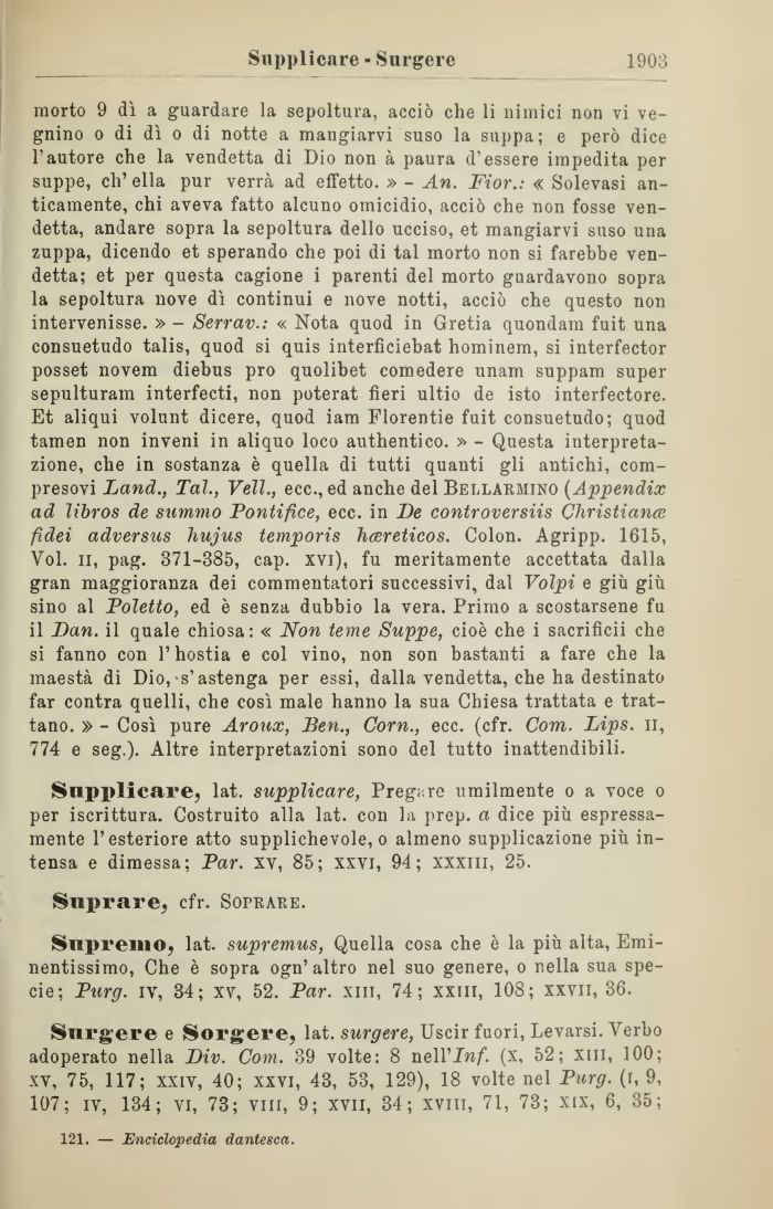 morto 9 dì a guardare la sepoltura, acciò che li nimici non vi ve-gnino o di dì o di notte a mangiarvi suso la suppa; e però dice l'autore che la vendetta di Dio non à paura d'essere impedita per suppe, eli' ella pur verrà ad effetto. » - An. Fior.: « Solevasi anticamente, chi aveva fatto alcuno omicidio, acciò che non fosse vendetta, andare sopra la sepoltura dello ucciso, et mangiarvi suso una zuppa, dicendo et sperando che poi di tal morto non si farebbe vendetta; et per questa cagione i parenti del morto guardavono sopra la sepoltura nove dì continui e nove notti, acciò che questo non intervenisse. » - Serrav.: « Nota quod in Gretia quondam fuit una consuetudo talis, quod si quis interficiebat hominem, si interfector posset novem diebus prò quolibet comedere nnam suppam super sepulturam interfecti, non poterat fieri ultio de isto interfectore. Et aliqui volunt dicere, quod iam Florentie fuit consuetudo; quod tamen non inveni in aliquo loco authentico. » - Questa interpretazione, che in sostanza è quella di tutti quanti gli antichi, compresovi Land., Tal., Veli., ecc., ed anche del Bellarmino (Appendix ad libros de summo Pontifice, ecc. in De controversiis Cliristiance fidei adversus hujus temporis hcereticos. Colon. Agripp. 1615, Voi. il, pag. 371-385, cap. xvi), fu meritamente accettata dalla gran maggioranza dei commentatori successivi, dal Volpi e giù giù sino al Poletto, ed è senza dubbio la vera. Primo a scostarsene fu il Dan. il quale chiosa: « Non teme Suppe, cioè che i sacrificii che si fanno con l'hostia e col vino, non son bastanti a fare che la maestà di Dio,-s'astenga per essi, dalla vendetta, che ha destinato far contra quelli, che così male hanno la sua Chiesa trattata e trattano. » - Così pure Aroux, Ben., Com., ecc. (cfr. Com. Lips. ii, 774 e seg.). Altre interpretazioni sono del tutto inattendibili.
