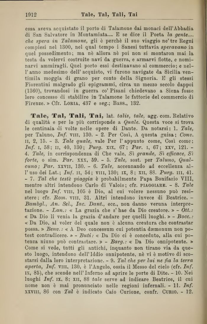 Tale, Tal, Tali, Tai, lat. talis, tale, agg. com. Relativo di qualità e per lo più corrisponde a Quale. Questa voce si trova le centinaia di volte nelle opere di Dante. Da notarsi: 1. Tale, per Taluno, Inf. vili, 130. - 2. Per Così, A questa guisa; Conv. il, 2, 15. - 3. Tale quale, vale Per l'appunto come, Così come; Inf. i, 58; il, 40, 130; Purg. xix, 67; Par. i, 67; xxv, 121. -4. Tale, in corrispondenza di Che vale, Sì grande, Sì efficace, Sì forte, o sim. Par. xxx, 59. - 5. Tale, sost. per Taluno, Qualcuno; Par. xxvil, 130. - 6. Tale, accennando ad eccellenza all'uso dei Lat.; Inf. il, 54; vili, 130; ix, 8; xii, 88. Purg. ni, 41. - 7. Tal che teste piaggia è probabilmente Papa Bonifazio Vili, mentre altri intendono Carlo di Valois; cfr. piaggiare. - 8. Tale nel luogo Inf. vili, 105 è Dio, al cui volere nessuno può resistere; cfr. Bovi, vili, 31. Altri intendono invece di Beatrice. -Bambgl., An. Sei., Iac. Dant., ecc., non danno veruna interpretazione. - Lan.: « La grazia che s'hae da Dio creatore. » - Ott. : « Da Dio li venia la grazia d'andare per quelli luoghi. » - Bocc.: « Da Dio, al voler del quale non è alcuna creatura che contrastar possa. » Benv. : « A Deo concessum cui potentia dasmonum non po-test contradicere. » - Buti: « Da Dio ci è conceduto, alla cui potenza niuno può contrastare. » - Barg.: « Da Dio onnipotente. » Come si vede, tntti gli antichi, inquanto non tirano via da questo luogo, intendono dell'Iddio onnipotente, nè vi è motivo di scostarsi dalla loro interpretazione. - 9. Tal che per lui ne fia la terra aperta, Inf. vili, 130, è l'Angelo, ossia il Messo del cielo (cfr. Inf. ix, 85), che scende nell'Inferno ad aprire le porte di Dite. - 10. Nei luoghi Inf. ix, 8; xii, 88 tale serve ad indicare Beatrice, il cui nome non è mai pronunciato nelle regioni infernali. - 11. Inf. xxviii, 86 con Tal è indicato Caio Curione, confr. Curio. - 12.