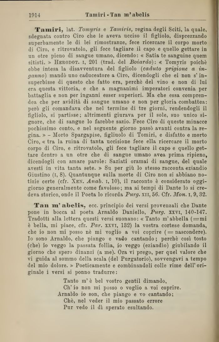 Tamiri, lat. Tomyris e Tamiris, regina degli Sciti, la quale, sdegnata contro Ciro che le aveva ucciso il figliolo, disprezzando superbamente le di lei rimostranze, fece ricercare il corpo morto di Ciro, e ritrovatolo, gli fece tagliare il capo e quello gettare in un otre pieno di sangue umano, dicendo: « Satia te sanguine quem sitisti. » Herodot. i, 201 (traci, del Boiardo): « Tomyris poiché ebbe intesa la disavventura del figliolo (caduto prigione a inganno) mandò uno caduceatore a Ciro, dicendogli che ei non s' insuperbisse di questo che fatto era, perchè del vino e non di lui era questa vittoria, e che a magnanimi imperatori convenia per battaglia e non per inganni esser superiori. Ma che essa compren-dea che per avidità di sangue umano e non per gloria combattea: però gli comandava che nel termine di tre giorni, rendendogli il figliolo, si partisse; altrimenti giurava per il sole, suo unico signore, che di sangue lo farebbe sazio. Fece Ciro di queste minacce pochissimo conto, e nel seguente giorno passò avanti contra la regina. » - Morto Spargapise, figliuolo di Tomiri, e disfatto e morto Ciro, « tra la ruina di tanta uccisione fece ella ricercare il morto corpo di Ciro, e ritrovatolo, gli fece tagliare il capo e quello gettare dentro a un otre che di sangue umano avea prima ripieno, dicendogli con amare parole: Saziati oramai di sangue, del quale avesti in vita tanta sete. » Su per giù lo stesso racconta eziandio Giustino (i, 8). Quantunque sulla morte di Ciro non si abbiano notizie certe (cfr. Xen. Anab. i, 10), il racconto è considerato oggigiorno generalmente come favoloso; ma ai tempi di Dante lo si credeva storico, onde il Poeta lo ricorda Purg. xn, 56. Cfr. Mon. i, 9, 32.