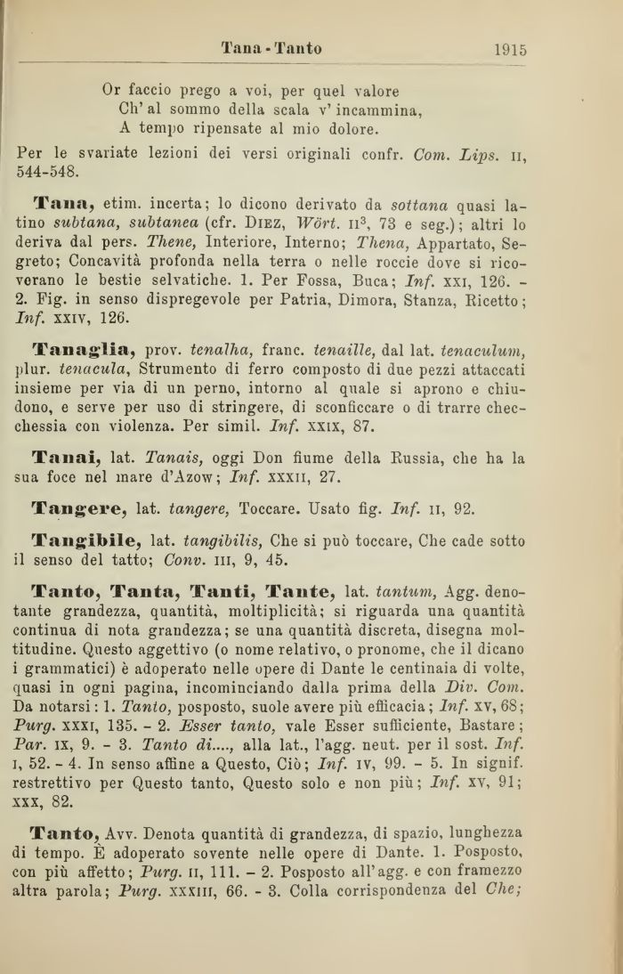 Tanto, Tanta, Tanti, Tante, lat. tantum, Agg. denotante grandezza, quantità, moltiplicità; si riguarda una quantità continua di nota grandezza; se una quantità discreta, disegna moltitudine. Questo aggettivo (o nome relativo, o pronome, che il dicano i grammatici) è adoperato nelle opere di Dante le centinaia di volte, quasi in ogni pagina, incominciando dalia prima della Div. Com. Da notarsi : 1. Tanto, posposto, suole avere più efficacia; Inf. xv, 68; Purg. xxxi, 135. - 2. Esser tanto, vale Esser sufficiente, Bastare ; Par. ix, 9. - 3. Tanto di...., alla lat., l'agg. neut. per il sost. Inf. i, 52. - 4. In senso affine a Questo, Ciò; Inf. iv, 99. - 5. In signif. restrettivo per Questo tanto, Questo solo e non più; Inf. xv, 91; xxx, 82.