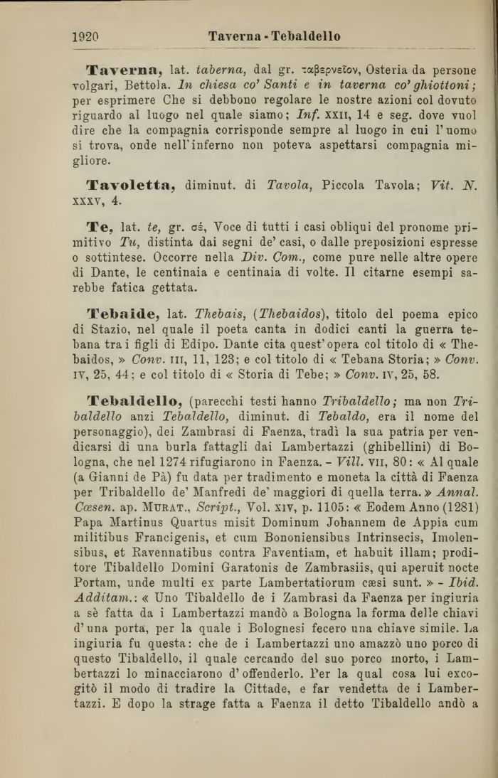 Tebaldello, (parecchi testi hanno Tribaldello ; ma non Tri-baldello anzi Tebaldello, diminut. di Tebaldo, era il nome del personaggio), dei Zambrasi di Faenza, tradì la sua patria per vendicarsi di una burla fattagli dai Lambertazzi (ghibellini) di Bologna, che nel 1274 rifugiarono in Faenza. - Vili. Vìi, 80: « Al quale (a Gianni de Pà) fu data per tradimento e moneta la città di Faenza per Tribaldello de' Manfredi de' maggiori di quella terra. » Annal. Ccesen. ap. Murat., Script., Voi. xiv, p. 1105: « Eodem Anno (1281) Papa Martinus Quartus misit Dominum Johannem de Appia cum militibus Francigenis, et cum Bononiensibus Intrinsecis, Imolen-sibus, et Ravennatibus contra Faventiam, et habuit illam; prodi-tore Tibaldello Domini Garatonis de Zambrasiis, qui aperuit nocte Portam, unde multi ex parte Lambertatiorum csesi sunt. » - Ibid. Additarne. « Uno Tibaldello de i Zambrasi da Faenza per ingiuria a sè fatta da i Lambertazzi mandò a Bologna la forma delle chiavi d'una porta, per la quale i Bolognesi fecero una chiave simile. La ingiuria fu questa: che de i Lambertazzi uno amazzò uno porco di questo Tibaldello, il quale cercando del suo porco morto, i Lambertazzi lo minacciarono d'offenderlo. Per la qual cosa lui exco-gitò il modo di tradire la Cittade, e far vendetta de i Lambertazzi. E dopo la strage fatta a Faenza il detto Tibaldello andò a