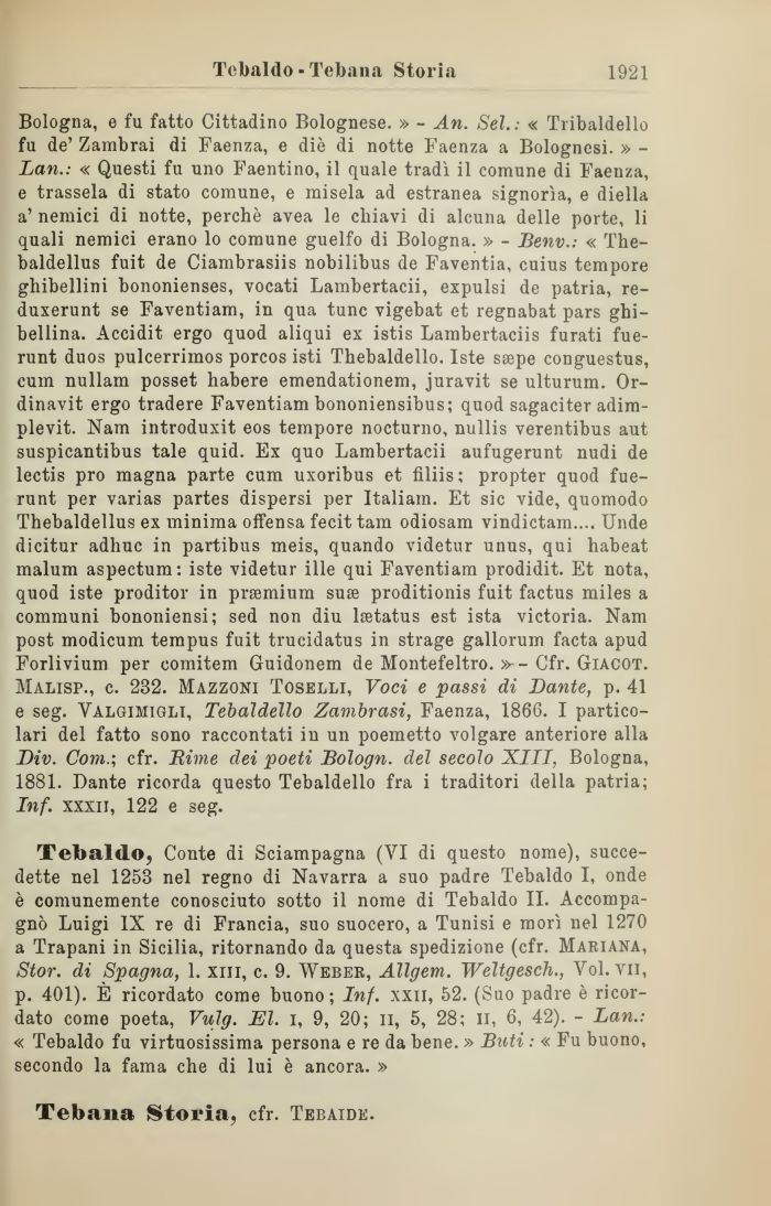 Bologna, e fu fatto Cittadino Bolognese. » - An. Sei.: « Tribaldello fu de' Zambrai di Faenza, e diè di notte Faenza a Bolognesi. » -Lan.: « Questi fu uno Faentino, il quale tradì il comune di Faenza, e trassela di stato comune, e misela ad estranea signorìa, e diella a' nemici di notte, perchè avea le chiavi di alcuna delle porte, li quali nemici erano lo comune guelfo di Bologna. » - Benv.: « The-baldellus fuit de Ciambrasiis nobilibus de Faventia, cuius tempore ghibellini bononienses, vocati Lambertacii, expulsi de patria, re-duxerunt se Faventiam, in qua tunc vigebat et regnabat pars ghibellina. Accidit ergo quod aliqui ex istis Lambertaciis furati fue-runt duos pulcerrimos porcos isti Thebaldello. Iste ssepe conguestus, cum nullam posset habere emendationem, juravit se ulturum. Or-dinavit ergo tradere Faventiam bononiensibus; quod sagaciter adim-plevit. Nam introduxit eos tempore nocturno, nullis verentibus aut suspicantibus tale quid. Ex quo Lambertacii aufugerunt nudi de lectis prò magna parte cum uxoribus et fìliis; propter quod fue-runt per varias partes dispersi per Italiani. Et sic vide, quomodo Thebaldellus ex minima offensa fecit tam odiosam vindictam.... Unde dicitur adhuc in partibus meis, quando videtur unus, qui habeat malum aspectum: iste videtur ille qui Faventiam prodidit. Et nota, quod iste proditor in prsemium suse proditionis fuit factus miles a communi bononiensi; sed non diu ltetatus est ista Victoria. Nam post modicum tempus fuit trucidatus in strage gallorum facta apud Forlivium per comitem Guidonem de Montefeltro. » - Cfr. Giacot. Malisp., c. 232. Mazzoni Toselli, Voci e passi di Dante, p. 41 e seg. Valgihigli, Tebaldello Zambrasi, Faenza, 1866. I particolari del fatto sono raccontati in un poemetto volgare anteriore alla Div. Com.; cfr. Rime dei poeti Bologn. del secolo XIII, Bologna, 1881. Dante ricorda questo Tebaldello fra i traditori della patria; Inf. xxxii, 122 e seg.