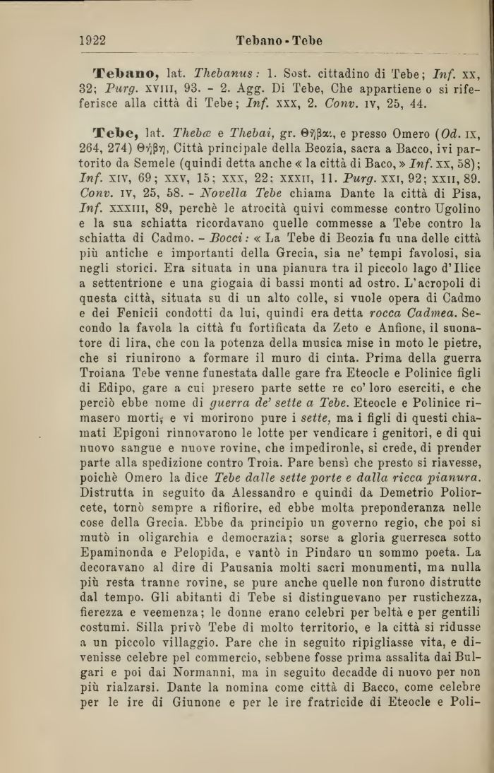 Tebe, lat. Thebce e Thebai, gr. 0yj,3a'., e presso Omero (Od. ix, 264, 274) ©v^Pyj, Città principale della Beozia, sacra a Bacco, ivi partorito da Semele (quindi detta anche « la città di Baco, » Inf. xx, 58); Inf. xiv, 69; xxv, 15; xxx, 22; xxxii, 11. Purg. xxi, 92; xxii, 89. Conv. iv, 25, 58. - Novella Tebe chiama Dante la città di Pisa, Inf. xxxm, 89, perchè le atrocità quivi commesse contro Ugolino e la sua schiatta ricordavano quelle commesse a Tebe contro la schiatta di Cadmo. - Bocci: « La Tebe di Beozia fu una delle città più antiche e importanti della Grecia, sia ne' tempi favolosi, sia negli storici. Era situata in una pianura tra il piccolo lago d'Ilice a settentrione e una giogaia di bassi monti ad ostro. L'acropoli di questa città, situata su di un alto colle, si vuole opera di Cadmo e dei Fenicii condotti da lui, quindi era detta rocca Cadmea. Secondo la favola la città fu fortificata da Zeto e Anfione, il suonatore di lira, che con la potenza della musica mise in moto le pietre, che si riunirono a formare il muro di cinta. Prima della guerra Troiana Tebe venne funestata dalle gare fra Eteocle e Polinice figli di Edipo, gare a cui presero parte sette re co' loro eserciti, e che perciò ebbe nome di guerra de' sette a Tebe. Eteocle e Polinice rimasero morti? e vi morirono pure i sette, ma i figli di questi chiamati Epigoni rinnovarono le lotte per vendicare i genitori, e di qui nuovo sangue e nuove rovine, che impedironle, si crede, di prender parte alla spedizione contro Troia. Pare bensì che presto si riavesse, poiché Omero la dice Tebe dalie sette porte e dalla ricca pianura. Distrutta in seguito da Alessandro e quindi da Demetrio Polior-cete, tornò sempre a rifiorire, ed ebbe molta preponderanza nelle cose della Grecia. Ebbe da principio un governo regio, che poi si mutò in oligarchia e democrazia; sorse a gloria guerresca sotto Epaminonda e Pelopida, e vantò in Pindaro un sommo poeta. La decoravano al dire di Pausania molti sacri monumenti, ma nulla più resta tranne rovine, se pure anche quelle non furono distrutte dal tempo. Gli abitanti di Tebe si distinguevano per rustichezza, fierezza e veemenza; le donne erano celebri per beltà e per gentili costumi. Siila privò Tebe di molto territorio, e la città si ridusse a un piccolo villaggio. Pare che in seguito ripigliasse vita, e divenisse celebre pel commercio, sebbene fosse prima assalita dai Bulgari e poi dai Normanni, ma in seguito decadde di nuovo per non più rialzarsi. Dante la nomina come città di Bacco, come celebre per le ire di Giunone e per le ire fratricide di Eteocle e Poli-