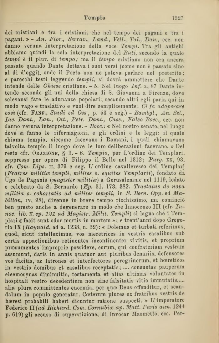 dei cristiani e tra i cristiani, che nel tempo dei pagani e tra i pagani. » - An. Fior., Serrav., Land., Veli., Tal., Dan., ecc. non danno veruna interpretazione della voce Tempi. Tra gli antichi abbiamo quindi la sola interpretazione del Buti, secondo la quale tempi è il plur. di tempo; ma il tempo cristiano non era ancora passato quando Dante dettava i suoi versi (come non è passato sino al dì d'oggi), onde il Poeta non ne poteva parlare nel preterito; e parecchi testi leggendo templi, si dovrà ammettere che Dante intende delle Chiese cristiane. - 5. Nel luogo Inf. x, 87 Dante intende secondo gli uni della chiesa di S. Giovanni a Firenze, dove solevansi fare le adunanze popolari; secondo altri egli parla qui in modo vago e traslativo e vuol dire semplicemente: Ci fa adoperare così (cfr. Fanf., Studi ed Oss, p. 53 e seg.) - Bambgl., An. Sei., Iac. Dant., Lan., Ott., Petr. Dant., Cass., Falso Bocc., ecc. non danno veruna interpretazione. - Bocc.: « Nel nostro senato, nel luogo dove si fanno le riformagioni, e gli ordini e le leggi: il quale chiama tempio, siccome facevano i Romani, i quali chiamavano talvolta tempio il luogo dove le loro deliberazioni facevano. » Del resto cfr. Orazione, § 3.-6. Tempio, per L'ordine dei Templari, soppresso per opera di Filippo il Bello nel 1312; Purg. xx, 93, cfr. Com. Lips. il, 379 e seg. L' ordine cavalleresco dei Templarj (Fratres militice templi, milites s. equites Templarii), fondato da Ugo de Paganis (magister militice) a Gerusalemme nel 1119, lodato e celebrato da S. Bernardo (Ep. 31. 173, 382. Tractatus de nova militia s. cohortatio ad milites templi, in S. Bern. Opp. ed Ma-billon, ìv, 98), divenne in breve tempo ricchissimo, ma cominciò ben presto anche a degenerare in modo che Innocenzo III (cfr. In-noc. lib. X. ep. 121 ad Magistr. Milit. Templi) si lagna che i Templari «facit sunt odor mortis in mortem »; e trent'anni dopo Gregorio IX (Baynald, ad a. 1238, n. 32): « Dolemus et turbati referimus, quod, sicut intelleximus, vos meretrices in vestris casalibus sub certis appactionibus retinentes incontinenter vivitis, et proprium prcesumentes improprie possidere, eorum, qui confrateriam vestram assumunt, datis in annis quatuor aut pluribus denariis, defensores vos facitis, ac latrones et interfectores peregrinorum, et hcereticos in vestris domibus et casalibus receptatis; .... consuetas pauperum eleemosynas diminuitis, testamenta et alias ultimas voluntates in hospitali vestro decedentium non sine falsitatis vitio immutatis,.... alia plura committentes enormia, per quse Deus offenditur, et scan-dalum in populo generatur. Cceterum plures ex fratribus vestris de hseresi probabili haberi dicuntur ratione suspecti. » L'imperatore Federico ll(ad Richard. Com. Cornubice ap. Matt. Paris ann. 1244 p. 619) gli accusa di superstizione, di invocar Maometto, ecc. Per-
