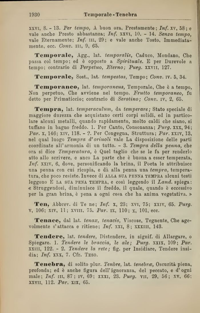 xxvi, 8. - 13. Per tempo, A buon ora, Prestamente; Inf. xv, 58; e vale anche Presto abbastanza; Inf. xxvi, 10. - 14. Senza tempo, vale Eternamente; Inf. ni, 29; e vale anche Tosto, Immediatamente, ecc. Conv. in, 9, 65.