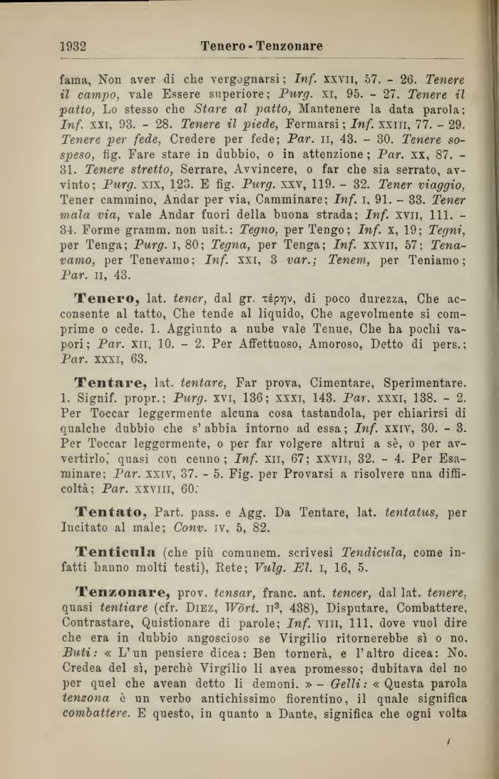 fama, Non aver di che vergognarsi; Inf. xxvn, 57. - 26. Tenere il campo, vale Essere superiore; Purg. xi, 95. - 27. Tenere il patto, Lo stesso che Stare al patto, Mantenere la data parola; Inf. xxi, 93. - 28. Tenere il piede, Fermarsi ; Inf. xxiii, 77. - 29. Tenere per fede, Credere per fede; Par. n, 43. - 30. Tenere sospeso, fig. Fare stare in dubbio, o in attenzione ; Par. xx, 87. -31. Tenere stretto, Serrare, Avvincere, o far che sia serrato, avvinto; Purg. xix, 123. E fig. Purg. xxv, 119. - 32. Tener viaggio, Tener cammino, Andar per via, Camminare; Inf. i, 91. - 33. Tener mala via, vale Andar fuori della buona strada; Inf. xvii, 111. -34. Forme gramm. non usit.: Tegno, per Tengo; Inf. x, 19; Tegni, per Tenga; Purg. i, 80; Tegna, per Tenga; Inf. xxvn, 57; Tena-vamo, per Tenevamo; Inf. xxi, 3 var.; Tenevi, per Teniamo; Par. il, 43.