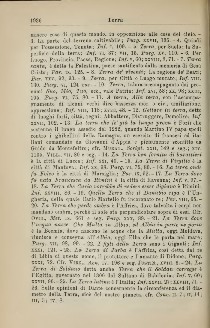 misere cose di questo mondo, in opposizione alle cose del cielo. -3. La parte del terreno coltivabile; Purg. xxvii, 135.-4. Quindi per Possessione, Tenuta; Inf. t, 109. - 5. Terra, per Suolo; la Superficie della terra; Inf. vi, 37; vii, 15. Purg. xv, 110. - 6. Per Luogo, Provincia, Paese, Regione ; Inf. v, 60; xxviii, 8, 71. - 7. Terra santa, è detta la Palestina, paese santificato dalla memoria di Gesù Cristo; Par. ix, 125. - 8. Terra de' viventi; La regione de'Beati; Par. xxv, 92, 93. - 9. Terra, per Città o Luogo murato; Inf. vili, 130. Purg. vi, 124 var. - 10. Terra, talora accompagnato dai pronomi Suo, Mio, Tuo, ecc., vale Patria; Inf. xvi, 58; xx, 98; xxiii, 105. Purg. vi, 75, 80.- 11. A terra, Alla terra, con l'accompagnamento di alcuni verbi dice bassezza mor. o civ., umiliazione, oppressione; Inf. vili, 118; xvm, 48. - 12. Gettare in terra, detto di luoghi forti, città, regni; Abbattere, Distruggere, Demolire; Inf. xxvii, 102. - 13. La terra che fé' già la lunga prova è Forlì che sostenne il lungo assedio del 1282, quando Martino IV papa spedì contro i ghibellini della Romagna un esercito di francesi ed italiani comandato da Giovanni d'Appia e pienamente sconfitto da Guido da Montefeltro; cfr. Murat., Script, xxii, 149 e seg.; xiv, 1105. Vill., vii, 80 e seg. -14. La Terra ben fornita di barattieri è la città di Lucca; Inf. xxi, 40. - 15. La Terra di Virgilio è la città di Mantova; Inf. xx, 98. Purg. vi, 75, 80. - 16. La terra onde fu Folco è la città di Marsiglia; Par. ix, 92.-17. La Terra dove fu nata Francesca da Rimini è la città di Ravenna; Inf. v, 97.-18. La Terra che Curio vorrebbe di vedere esser digiuno è Rimini; Inf. xxviii, 86. - 19. Quella Terra che il Danubio riga è l'Ungheria, della quale Carlo Martello fu incoronato re ; Par. vili, 65. -20. La Terra che perde ombra è l'Affrica, dove talvolta i corpi non mandano ombra, perchè il sole sta perpendicolare sopra di essi. Cfr. Ovid., Met. ix, 661 e seg. Purg. xxx, 89. - 21. La Terra dove V acqua nasce, Che Multa in Albia, ed Albia in parte ne porta è la Boemia, dove nascono le acque che la Multa, oggi Moldava, riunisce e consegna &WAlbia, oggi Elba che le porta nel mare; Purg. vii, 98, 99. - 22. I figli della Terra sono i Giganti; Inf. xxxi, 121. - 23. La Terra di Jarba è l'Affrica, così detta dal re di Libia di questo nome, il protettore e l'amante di Didone; Purg. xxxi, 72. Cfr. Virg., Aen. iv, 196 e seg. Justin., xviii. 6. - 24. La Terra di Soldano detta anche Terra che il Soldan corregge è l'Egitto, governato nel 1300 dal Sultano di Babilonia; Inf. v, 60; xxvii, 90.-25. La Terra latina è l'Italia; Inf. xxvii, 27; xxviii, 71.-26. Sulle opinioni di Dante concernente la circonferenza ed il diametro della Terra, cioè del nostro pianeta, cfr. Conv. il, 7 ; li, 14 ; ni, 5; iv, 8.
