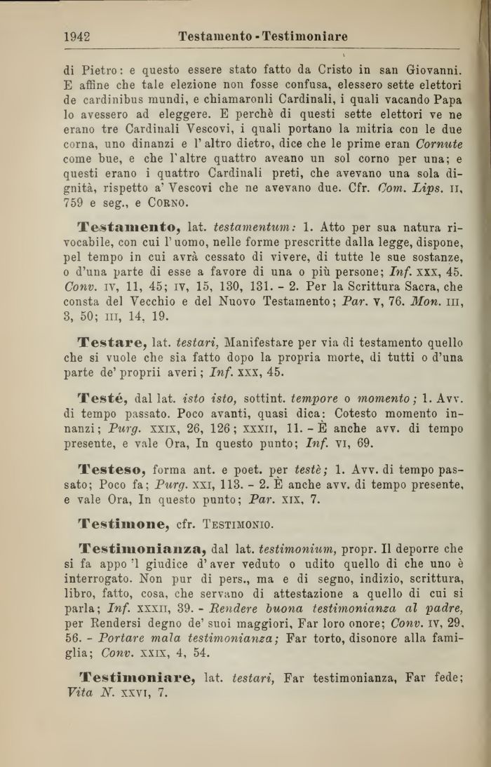 Testamento, lat. testamentum: 1. Atto per sua natura ri-vocabile, con cui l'uomo, nelle forme prescritte dalla legge, dispone, pel tempo in cui avrà cessato di vivere, di tutte le sue sostanze, o d'una parte di esse a favore di una o più persone; Inf. xxx, 45. Conv. iv, 11, 45; iv, 15, 130, 131. - 2. Per la Scrittura Sacra, che consta del Vecchio e del Nuovo Testamento; Par. v, 76. Mon. ni, 3, 50; ni, 14, 19.