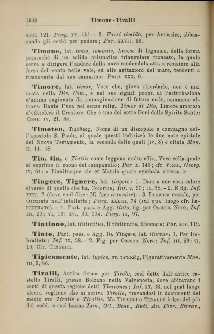 Tingere, Tignere, lat. tingere: 1. Dare a un?, cosa colore diverso di quello che ha, Colorire; Inf. v, 90; ix, 38. - 2. E fig. Inf. xxxi, 2 (dove vuol dire : Mi fece arrossire). - 3. In senso morale, per Oscurato nell'intelletto; Purg. xxxiii, 74 (sul qual luogo cfr. Impietrato). - 4. Part. pass, e Agg. tinto, fig. per Oscuro, Nero; Inf. in, 29; vi, 10; xvi, 30, 104. Purg. ix, 97.