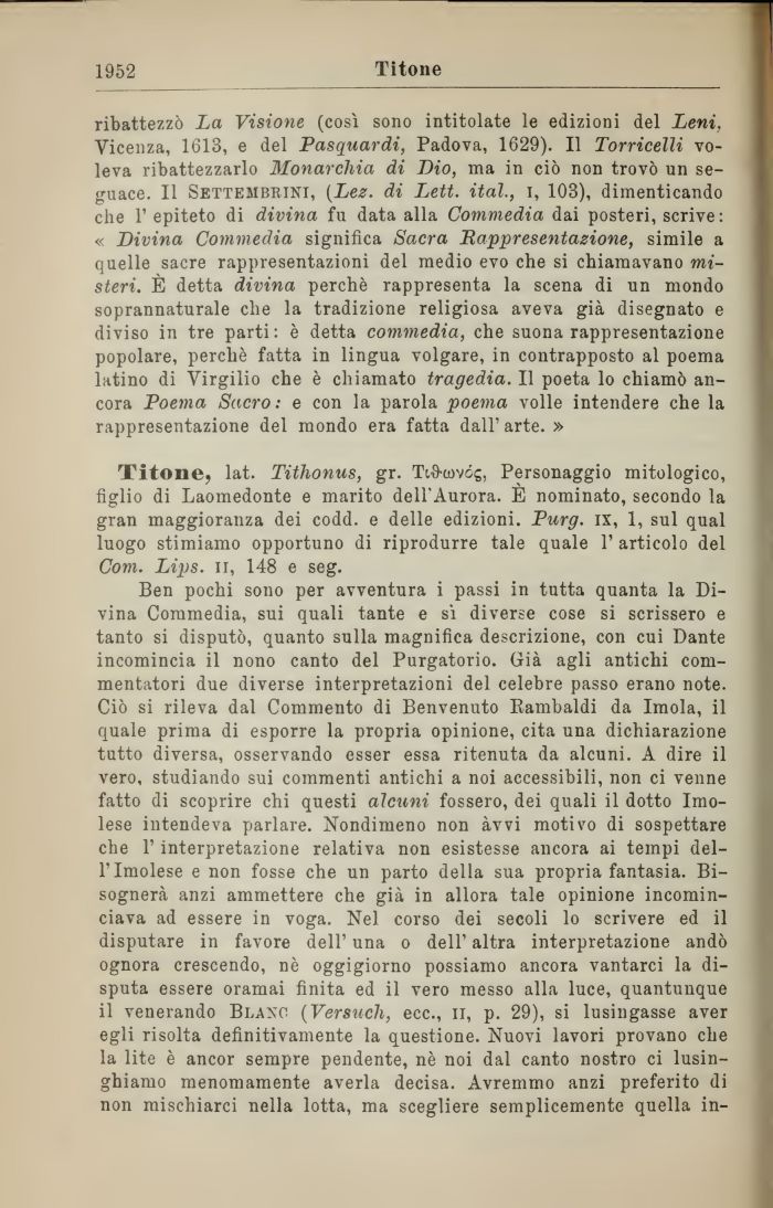 Titone, lat. Tithonus, gr. TiO-covóg, Personaggio mitologico, figlio di Laomedonte e marito dell'Aurora. E nominato, secondo la gran maggioranza dei codd. e delle edizioni. Purg. ix, 1, sul qual luogo stimiamo opportuno di riprodurre tale quale 1' articolo del Com. Lips. li, 148 e seg.