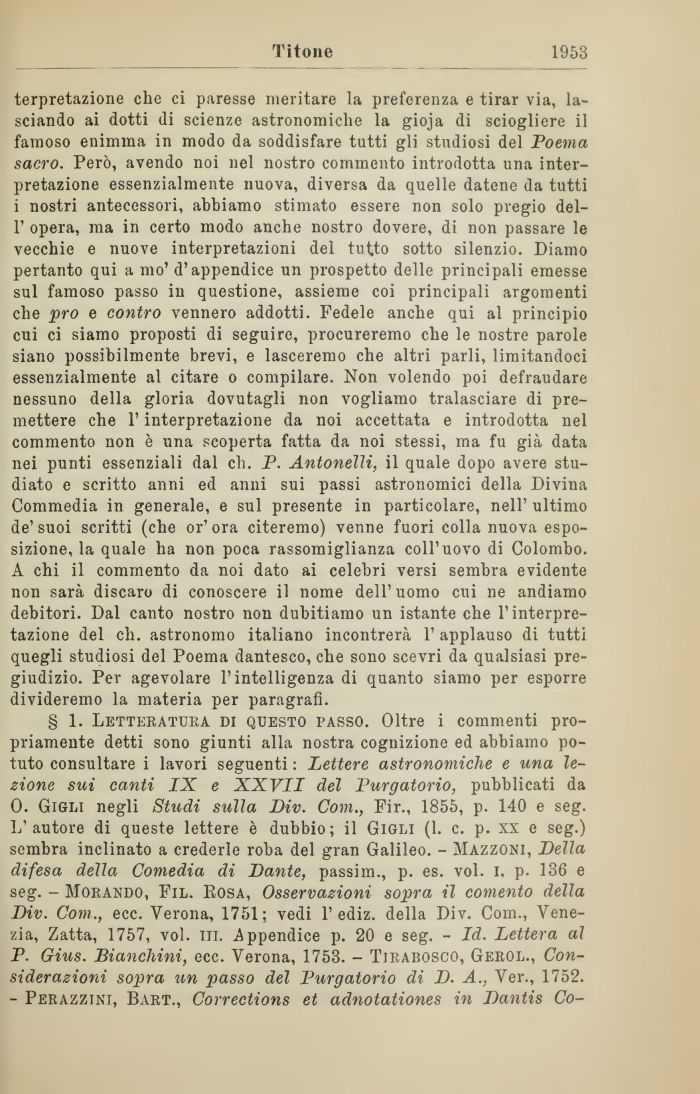 terpretazione che ci paresse meritare la preferenza e tirar via, lasciando ai dotti di scienze astronomiche la gioja di sciogliere il famoso enimma in modo da soddisfare tutti gli studiosi del Poema sacro. Però, avendo noi nel nostro commento introdotta una interpretazione essenzialmente nuova, diversa da quelle datene da tutti i nostri antecessori, abbiamo stimato essere non solo pregio dell' opera, ma in certo modo anche nostro dovere, di non passare le vecchie e nuove interpretazioni del tutto sotto silenzio. Diamo pertanto qui a mo' d'appendice un prospetto delle principali emesse sul famoso passo in questione, assieme coi principali argomenti che prò e contro vennero addotti. Fedele anche qui al principio cui ci siamo proposti di seguire, procureremo che le nostre parole siano possibilmente brevi, e lasceremo che altri parli, limitandoci essenzialmente al citare o compilare. Non volendo poi defraudare nessuno della gloria dovutagli non vogliamo tralasciare di premettere che l'interpretazione da noi accettata e introdotta nel commento non è una scoperta fatta da noi stessi, ma fu già data nei punti essenziali dal eh. P. Antoneììi, il quale dopo avere studiato e scritto anni ed anni sui passi astronomici della Divina Commedia in generale, e sul presente in particolare, nell' ultimo de'suoi scritti (che or'ora citeremo) venne fuori colla nuova esposizione, la quale ha non poca rassomiglianza coll'uovo di Colombo. A chi il commento da noi dato ai celebri versi sembra evidente non sarà discaro di conoscere il nome dell'uomo cui ne andiamo debitori. Dal canto nostro non dubitiamo un istante che l'interpretazione del eh. astronomo italiano incontrerà 1' applauso di tutti quegli studiosi del Poema dantesco, che sono scevri da qualsiasi pregiudizio. Per agevolare l'intelligenza di quanto siamo per esporre divideremo la materia per paragrafi.