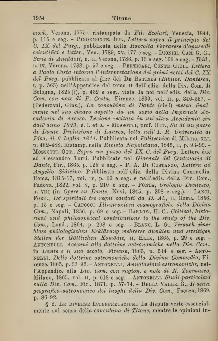 mced., Verona, 1775 ; ristampata da FU. Scolari, Venezia, 1844, p. 115 e seg. - Pindemonte, Ipp., Lettera sopra il principio del C. IX del Purg., pubblicata nella Eaccolta Ferrarese d'opuscoli scientifici e letter., Ven., 1789, xv, 177 e seg. - Dionisi, Can. G. G., Serie di Aneddoti, n. ti, Verona, 1786, p. 13 e seg. 106 e seg. - Ibid., n. ģv, Verona, 1788, p. 57 e seg. - Perticari, Conte Giul., Lettera a Paolo Costa intorno l'interpretazione dei primi versi del C. IX del Purg. pubblicata al jlire del De Batines (Bibliot. Dantesca, i, p. 565) nell'Appendice del tomo n dell'ediz. della Dir. Com. di Bologna, 1825 (?), p. 432 e seg., vista da noi nell'ediz. della Div. Com. coti note di P. Costa, Firenze, 1839, voi. n, p. 346-357. -(Pederzani, Gius.), La concubina di Dante (sic !) messa finalmente nel suo chiaro aspetto da un sozio della Imperiale Accademia di Arezzo. Lezione recitata in un'altra Accademia sin dall'anno 1823, s. 1. et a. - Mossotti, prof. Ott., Su di un passo di Dante. Prolusione di Laurea, letta nell' I. R. Universitą di Pisa, il 6 luglio 1844. Pubblicata nel Politecnico di Milano, xli, p. 482-488. Ristamp. nella Rivista Napoletana, 1845, il, p. 93-99. -Mossotti, Ott., Sopra un passo del IX C. del Purg. Lettere due ad Alessandro Torri. Pubblicate nel Giornale del Centenario di Dante, Fir., 1865, p. 125 e seg. - P. A. Di Costanzo, Lettera ad Angelio Sidicino. Pubblicata nell' ediz. della Divina Commedia. Roma, 1815-17, voi. ģv, p. 60 e seg. e nell'ediz. della Div. Com., Padova, v1822, voi. v, p. 210 e seg. - Ponta, Orologio Dantesco, n. vili (in Opere su Dante, Novi, 1845, p. 208 e seg.). - Lanci, Fort., De' spiritali tre regni cantati da D. Al., n, Roma, 1856, p. 15 e seg. - Capocci, Illustrazioni cosmografiche della Divina Com., Napoli, 1856, p. 69 e seg. - Barlow, H. C., Criticai, histo-rical and pliilosophical contributions to the study of the Div. Com., Lond., 1864, p. 208 e seg. - Blanc, L. G., Versuch einer bloss philologischen Erlilązung mehrerer dunklen und streitigen Stellen der Gņttlichen Komódie, li, Halle, 1865, p. 29 e seg. -Antonelli, Accenni alle dottrine astronomiche nella Div. Com., in Dante e il suo secolo, Firenze, 1865, p. 514 e seg. - Antonelli, Delle dottrine astronomiche della Divina Commedia, Firenze, 1865, p. 33-92. - Antonelli, Annotazioni astronomiche, nell'Appendice alla Div. Com. con ragion, e note di N. Tommaseo, Milano, 1865, voi. n, p. 618 e seg. - Antonelli, Studi particolari sulla Div. Com., Fir., 1871, p. 57-74. - Della Valle, G., Il senso geografico-astronoģnico dei luoghi della Div. Com., Faenza, 1869, p. 86-92.
