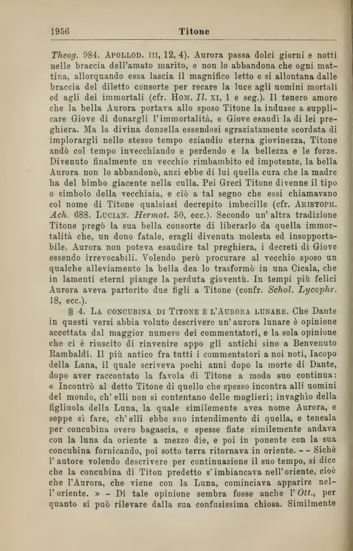 § 4. La concubina di Titone è l'Aurora lunare. Che Dante in questi versi abbia voluto descrivere un'aurora lunare è opinione accettata dal maggior numero dei commentatori, e la sola opinione che ci è riuscito di rinvenire appo gli antichi sino a Benvenuto Rambaldi. Il più antico fra tutti i commentatori a noi noti, Iacopo della Lana, il quale scriveva pochi anni dopo la morte di Dante, dopo aver raccontato la favola di Titone a modo suo continua: « Incontrò al detto Titone di quello che spesso incontra alii uomini del mondo, eh' elli non si contentano delle moglieri; invaghìo della figliuola della Luna, la quale similemente avea nome Aurora, e seppe sì fare, eh' elli ebbe suo intendimento di quella, e teneala per concubina overo bagascia, e spesse fiate similemente andava con la luna da oriente a mezzo die, e poi in ponente con la sua concubina fornicando, poi sotto terra ritornava in oriente. — Sichè 1' autore volendo descrivere per continuazione il suo tempo, si dice che la concubina di Titon predetto s'imbiancava nell'oriente, cioè che l'Aurora, che viene con la Luna, cominciava apparire nel-l'oriente. » - Di tale opinione sembra fosse anche l'Ott., per quanto si può rilevare dalla sua confusissima chiosa. Similmente