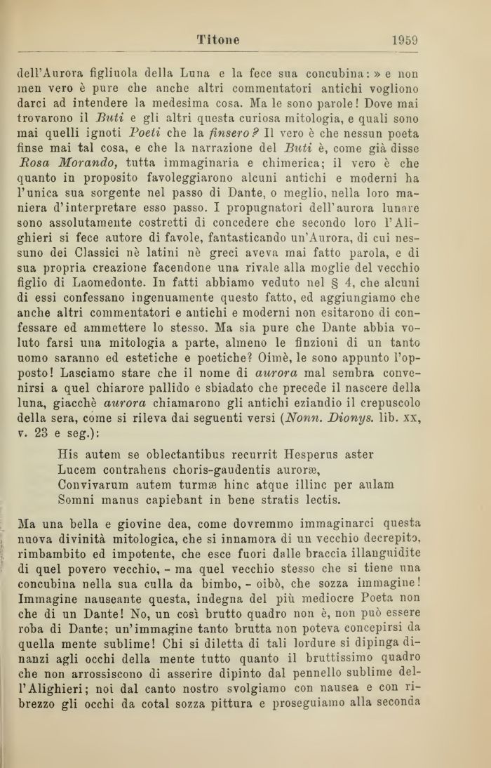 dell'Aurora figliuola della Luna e la fece sua concubina:» e non inen vero è pure che anche altri commentatori antichi vogliono darci ad intendere la medesima cosa. Ma le sono parole! Dove mai trovarono il Buti e gli altri questa curiosa mitologia, e quali sono mai quelli ignoti Poeti che la finsero? Il vero è che nessun poeta finse mai tal cosa, e che la narrazione del Buti è, come già disse JRosa Morando, tutta immaginaria e chimerica; il vero è che quanto in proposito favoleggiarono alcuni antichi e moderni ha l'unica sua sorgente nel passo di Dante, o meglio, nella loro maniera d'interpretare esso passo. I propugnatori dell'aurora lunare sono assolutamente costretti di concedere che secondo loro l'Alighieri si fece autore di favole, fantasticando un'Aurora, di cui nessuno dei Classici nè latini nè greci aveva mai fatto parola, e di sua propria creazione facendone una rivale alla moglie del vecchio figlio di Laomedonte. In fatti abbiamo veduto nel § 4, che alcuni di essi confessano ingenuamente questo fatto, ed aggiungiamo che anche altri commentatori e antichi e moderni non esitarono di confessare ed ammettere lo stesso. Ma sia pure che Dante abbia voluto farsi una mitologia a parte, almeno le finzioni di un tanto uomo saranno ed estetiche e poetiche? Oimè, le sono appunto l'opposto! Lasciamo stare che il nome di aurora mal sembra convenirsi a quel chiarore pallido e sbiadato che precede il nascere della luna, giacché aurora chiamarono gli antichi eziandio il crepuscolo della sera, come si rileva dai seguenti versi (Nomi. Dionys. lib. xx, v. 23 e seg.):
