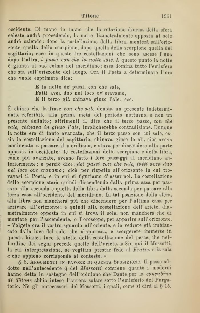 § 8. Argomenti in favore di questa Sposizione. Il passo addotto nell'antecedente § del Mossotti contiene quanto i moderni hanno detto in sostegno dell'opinione che Dante per la concubina di Titone abbia inteso l'aurora solare sotto l'emisferio del Purgatorio. Nè gli antecessori del Mossotti, i quali, come si dirà al § 15,
