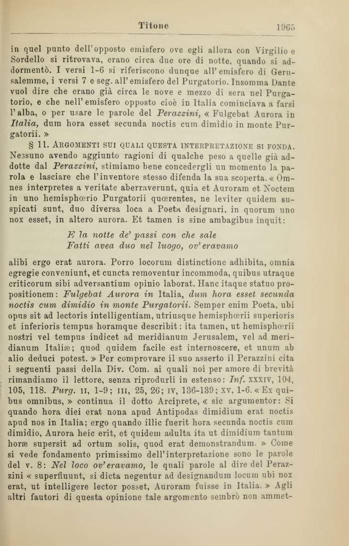 alibi ergo erat aurora. Porro locorum distinctione adhibita, omnia egregie conveniunt, et cuncta removentur incommoda, quibus utraque criticorum sibi adversantium opinio laborat. Hanc itaque statuo pro-positionem : Fulgebat Aurora in Italia, dum hora esset secunda noctis cum dimidio in monte Purgatorii. Semper enim Poeta, ubi opus sit ad lectoris intelligentiam, utriusque hemisphoerii superioris et inferioris tempus horamque describit : ita tamen, ut hemisphoerii nostri vel tempus indicet ad meridianum Jerusalem, vel ad meri-dianum Italia; quod quidem facile est internoscere, et unum ab alio deduci potest. » Per comprovare il suo asserto il Perazzini cita i seguenti passi della Div. Com. ai quali noi per amore di brevità rimandiamo il lettore, senza riprodurli in estenso: Inf. xxxiv, 104, 105, 118. Purg. il, 1-9; iii, 25, 26; iv, 136-139; xv, 1-6. « Ex quibus omnibus,» continua il dotto Arciprete, « sic argumentor: Si quando hora diei erat nona apud Antipodas dimidium erat noctis apud nos in Italia; ergo quando illic fuerit hora secunda noctis cum dimidio, Aurora heic erit, et quidem adulta ita ut dimidium tantum hora supersit ad ortum solis, quod erat demonstrandum. » Come si vede fondamento primissimo dell'interpretazione sono le parole del v. 8: Nel loco ov'eravamo, le quali parole al dire del Perazzini « superfluunt, si dieta negentur ad designandum locum ubi nox erat, ut intelligerè lector posset, Auroram fuisse in Italia. » Agli altri fautori di questa opinione tale argomento sembrò non ammet-