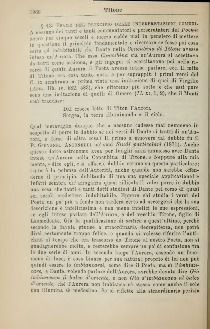 § -13. Esame del principio delle interpretazioni comuni. A nessuno dei tanti e tanti commentatori e perscrutatori del Poema sacro per cinque secoli e mezzo cadde mai in pensiero di mettere in ìiestione il principio fondamentale e ricercare se fosse poi cosa certa ed indubitabile che Dante nella Concubina di Titone avesse inteso un'Aurora. Che essa Concubina sia un'Aurora si accettava da tutti come assioma, e gli ingegni si esercitavano poi nella ricerca di quale Aurora il Poeta avesse inteso parlare, ecc. Il mito di Titone era cosa tanto nota, e per soprappiù i primi versi del C. ix sembrano a prima vista una imitazione di quei di Virgilio (Aen., lib. iv, 582, 583), che citeremo più sotto e che essi pure sono una imitazione di quelli di Omero (II. xi, 1, 2), che il Monti così tradusse :