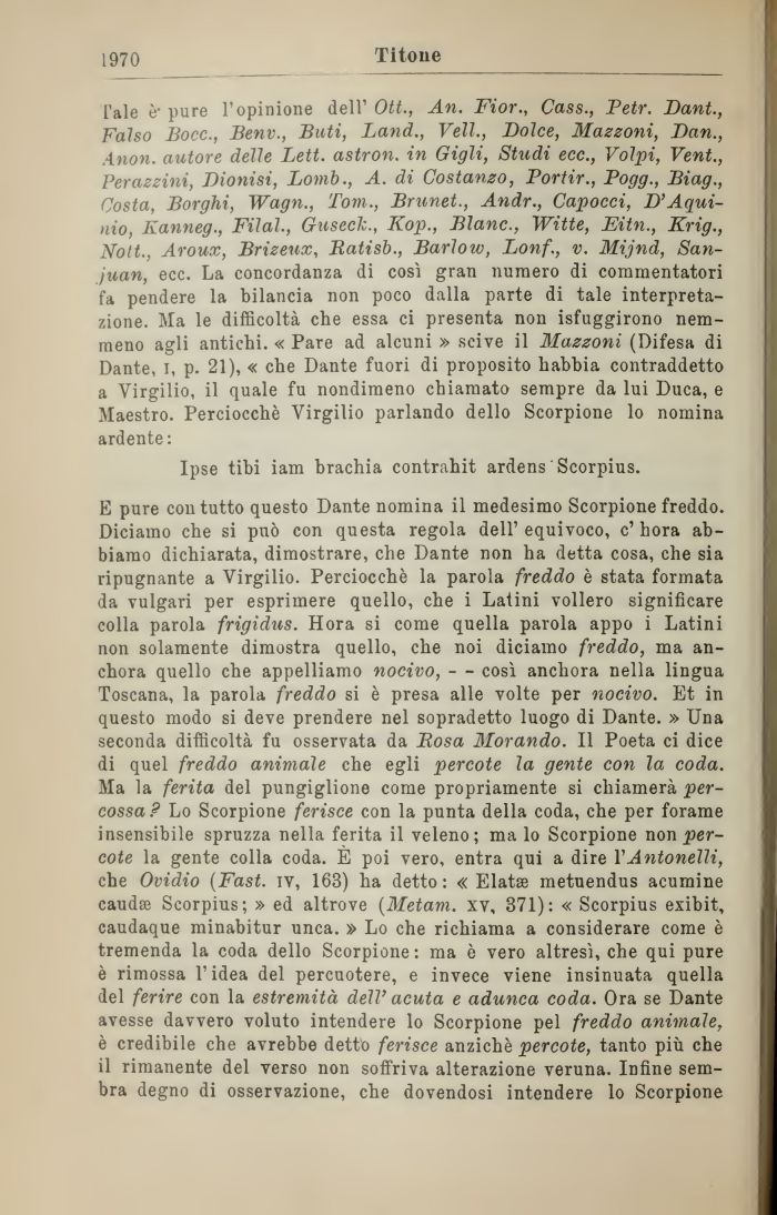 E pure con tutto questo Dante nomina il medesimo Scorpione freddo. Diciamo che si può con questa regola dell' equivoco, c' hora abbiamo dichiarata, dimostrare, che Dante non ha detta cosa, che sia ripugnante a Virgilio. Perciocché la parola freddo è stata formata da vulgari per esprimere quello, che i Latini vollero significare colla parola frigidus. Hora si come quella parola appo i Latini non solamente dimostra quello, che noi diciamo freddo, ma an-chora quello che appelliamo nocivo, - - così anchora nella lingua Toscana, la parola freddo si è presa alle volte per nocivo. Et in questo modo si deve prendere nel sopradetto luogo di Dante. » Una seconda difficoltà fu osservata da Bosa Morando. Il Poeta ci dice di quel freddo animale che egli percote la gente con la coda. Ma la ferita del pungiglione come propriamente si chiamerà percossa ? Lo Scorpione ferisce con la punta della coda, che per forame insensibile spruzza nella ferita il veleno; ma lo Scorpione non percote la gente colla coda. È poi vero, entra qui a dire VAntonelli, che Ovidio (Fast, iv, 163) ha detto : « Elatse metuendus acumine caudee Scorpius; » ed altrove (Metani, xv, 371): « Scorpius exibit, caudaque minabitur unca. » Lo che richiama a considerare come è tremenda la coda dello Scorpione: ma è vero altresì, che qui pure è rimossa l'idea del percuotere, e invece viene insinuata quella del ferire con la estremità dell' acuta e adunca coda. Ora se Dante avesse davvero voluto intendere lo Scorpione pel freddo animale, è credibile che avrebbe detto ferisce anziché percote, tanto più che il rimanente del verso non soffriva alterazione veruna. Infine sembra degno di osservazione, che dovendosi intendere lo Scorpione