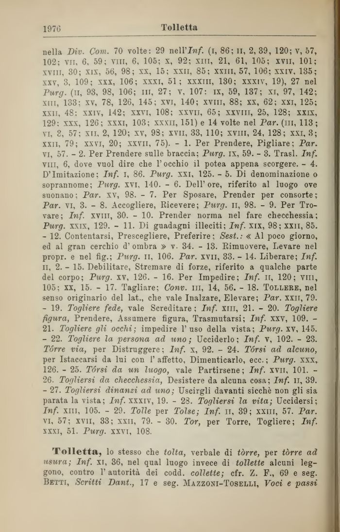 - 27. Togliersi dinanzi ad uno; Uscirgli davanti sicché non gli sia parata la vista; Inf. xxxiv, 19. - 28. Togliersi la vita; Uccidersi; Inf. xm, 105. - 29. Tolle per Tolse; Inf. ir, 39; xxiii, 57. Par. vi, 57; xvn, 33; xxii, 79. - 30. Tor, per Torre, Togliere; Inf. xxxi, 51. Purg. xxvi, 108.