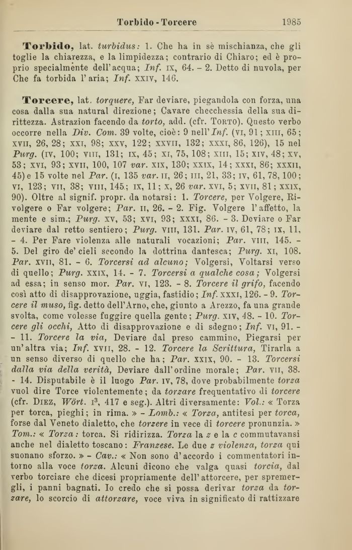 - 14. Disputabile č il luogo Par. IV, 78, dove probabilmente torza vuol dire Torce violentemente ; da forzare frequentativo di torcere (cfr. Diez, Wņrt. i3, 417 e seg.). Altri diversamente: Voi: « Torza per torca, pieghi; in rima. » - Lomb.: « Torza, antitesi per torca, forse dal Veneto dialetto, che torzere in vece di torcere pronunzia. » Tom.: « Torza : torca. Si ridirizza. Torza la z e la c commutavansi anche nel dialetto toscano : Franzese. Le due z violenza, torza qui suonano sforzo. » - Cav.: « Non sono d' accordo i commentatori intorno alla voce torza. Alcuni dicono che valga quasi torcia, dal verbo torciare che dicesi propriamente dell' attorcere, per spremergli, i panni bagnati. Io credo che si possa derivar torza da tornare, lo scorcio di attorzare, voce viva in significato di rattizzare