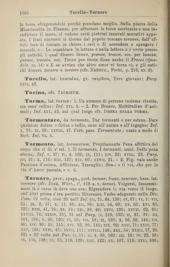 Tornare, prov., spagn., port. tornar, frane, tourner, bass. lat. tornare (cfr. Diez, Wòrt., l3, 418 s. v. torno). Volgersi, Incamminarsi là o verso là dove uno era; Riprendere la via verso il luogo, ond'altri prima s'era partito; Ritornare. Verbo adoperato nella Div. Com. 79 volte, cioè 26 nell'In/, (n, 71, 84, 138; iv, 81: vi, 1; vii, 31; ix, 2, 57; x, 11, 49; xii, 98; xm, 54, 69; xv, 53; xvi, 83, 133; xvii, 41, 78; xx, 13; xxi, 39, 46; xxvi, 136; xxvn, 62, 65; xxviii, 74; xxxiv, 81), 31 nel Purg. (i, 119, 132; ii, 81, 91; iii, 101, 134; v, 40, 130; vi, 55; vii, 58; ix, 132; x, 86, 88, 144; xii, 80; xiv, 99; xv, 115; xvi, 32, 90, 145; xix, 92; xxii, 71;XXiv, 77; xxv, 133; xxvi, 47; xxvn, 111; xxviii, 148; xxx, 54; xxxii, 17, 25, 82) e 22 volte nel Par. (i, 51; n, 4, 89, 102; in, 13; iv, 23, 58; ix, 104, 108; xi, 13, 116, 129; xm, 122; xx, 107, 113; xxii, 106;