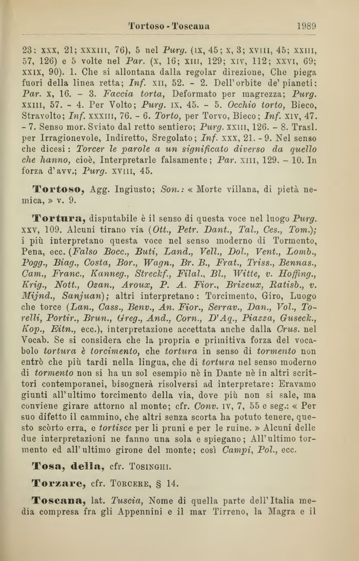 Tortura, disputabile è il senso di questa voce nel luogo Purg. xxv, 109. Alcuni tirano via (Ott., Petr. Dant., Tal., Ces., Tom.); i più interpretano questa voce nel senso moderno di Tormento, Pena, ecc. (Falso Bocc., Buti, Land., Veli., Dol., Vent., Lomb., Pogg., Biag., Costa, Bor., Wagn., Br. B., Frat., Triss., Bennas., Cam., Frane., Kanneg., Streckf., Filai., Bl., Witte, v. Hoffing., Krig., Nott., Ozan., Aroux, P. A. Fior., Brizeux, Batisb., v. Mijnd., Sanjuan); altri interpretano: Torcimento, Giro, Luogo che torce (Lan., Cass., Benv., An. Fior., Serrav., Dan., Voi., Torelli, Portir., Bruii., Greg., And., Com., D'Aq., Piazza, GusecTi., Kop., Eitn., ecc.), interpretazione accettata anche dalla Crus. nel Vocab. Se si considera che la propria e primitiva forza del vocabolo tortura è torciviento, che tortura in senso di tormento non entrò che più tardi nella lingua, che di tortura nel senso moderno di tormento non si ha un sol esempio nè in Dante nè in altri scrittori contemporanei, bisognerà risolversi ad interpretare: Eravamo giunti all'ultimo torcimento della via, dove più non si sale, ma conviene girare attorno al monte; cfr. Conv. iv, 7, 55 e seg.: « Per suo difetto il cammino, che altri senza scorta ha potuto tenere, questo scòrto erra, e tortisce per li pruni e per le ruine. » Alcuni delle due interpretazioni ne fanno una sola e spiegano; All'ultimo tormento ed all'ultimo girone del monte; così Campi, Poi., ecc.