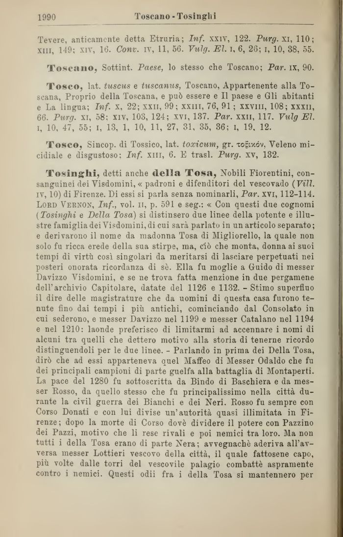 Tosinghi, detti anche della Tosa, Nobili Fiorentini, consanguinei dei Visdomini, « padroni e difenditori del vescovado (Vili. iv, 10) di Firenze. Di essi si parla senza nominarli, Par. xvi, 112-114. Lord Vernon, Inf., voi. n, p. 591 e seg.: « Con questi due cognomi (Tosinghi e Della Tosa) si distinsero due linee della potente e illustre famiglia dei Visdomini, di cui sarà parlato in un articolo separato ; e derivarono il nome da madonna Tosa di Migliorello, la quale non solo fu ricca erede della sua stirpe, ma, ciò che monta, donna ai suoi tempi di virtù così singolari da meritarsi di lasciare perpetuati nei posteri onorata ricordanza di sè. Ella fu moglie a Guido di messer Davizzo Visdomini, e se ne trova fatta menzione in due pergamene dell'archivio Capitolare, datate del 1126 e 1132. - Stimo superfluo il dire delle magistrature che da uomini di questa casa furono tenute fino dai tempi i più antichi, cominciando dal Consolato in cui sederono, e messer Davizzo nel 1199 e messer Catalano nel 1194 e nel 1210: laonde preferisco di limitarmi ad accennare i nomi di alcuni tra quelli che dettero motivo alla storia di tenerne ricordo distinguendoli per le due linee. - Parlando in prima dei Della Tosa, dirò che ad essi apparteneva quel Maffeo di Messer Odaldo che fu dei principali campioni di parte guelfa alla battaglia di Montaperti. La pace del 1280 fu sottoscritta da Bindo di Baschiera e da messer Rosso, da quello stesso che fu principalissimo nella città durante la civil guerra dei Bianchi e dei Neri. Rosso fu sempre con Corso Donati e con lui divise un'autorità quasi illimitata in Firenze; dopo la morte di Corso dovè dividere il potere con Pazzino dei Pazzi, motivo che li rese rivali e poi nemici tra loro. Ma non tutti i della Tosa erano di parte Nera; avvegnaché aderiva all'avversa messer Lottieri vescovo della città, il quale fattosene capo, più volte dalle torri del vescovile palagio combattè aspramente contro i nemici. Questi odii fra i della Tosa si mantennero per