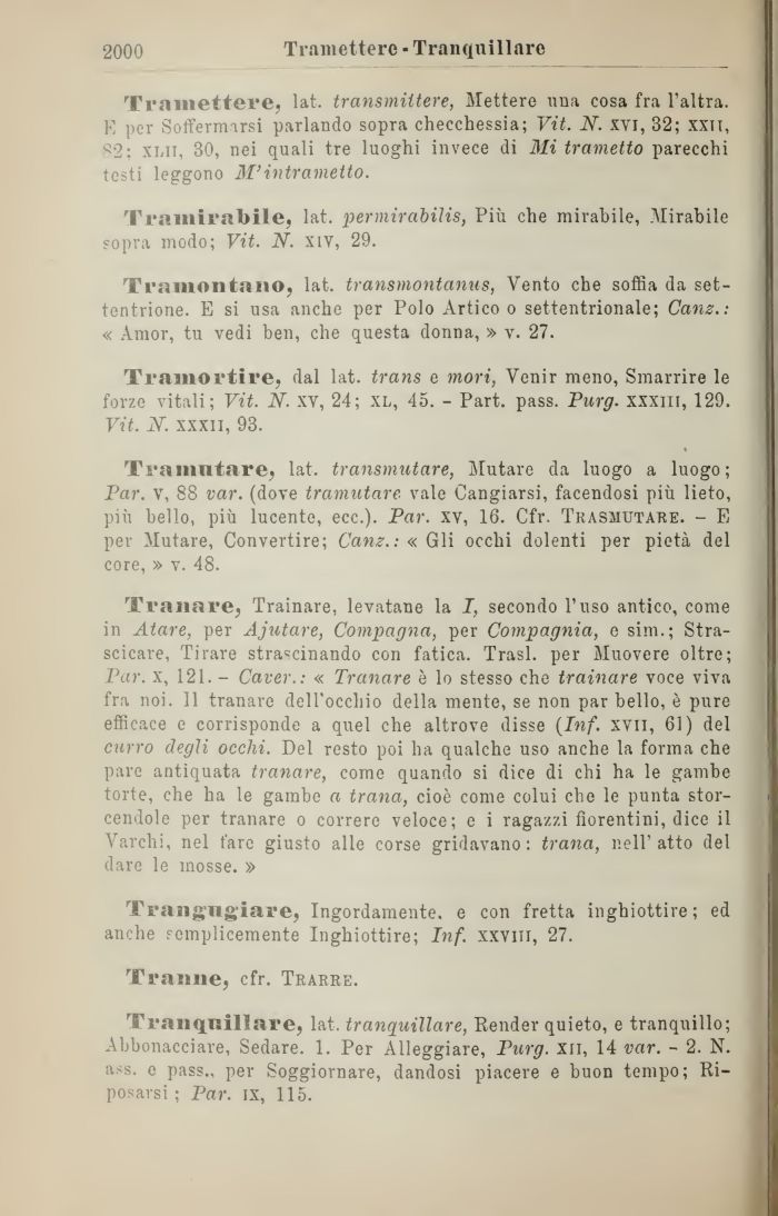 Tramettere, lat. transmiitere, Mettere uua cosa fra l'altra. E per Soffermarsi parlando sopra checchessia; Vit. N. xvi, 32; xxn, ^2: xlii, 30, nei quali tre luoghi invece di Mi trametto parecchi