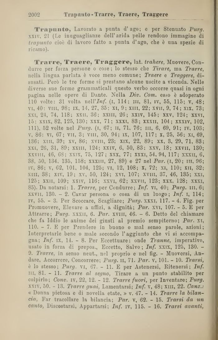 Trarre, Traere, Traggere, lat. trahere, Muovere, Condurre per forza persone o cose ; lo stesso che Tirare, ma Trarre, nella lingua parlata è voce meno comune; Traere e Traggere, disusati. Però le tre forme si prestano alcune uscite a vicenda. Nelle diverse sue formo grammaticali questo verbo occorre quasi in ogni pagina nelle opere di Dante. Nella Div. Com. esso è adoperato 110 volte: 31 volta nell'Inf. (i, 114; ni, 81, iv, 55, 115; v, 48; vi, 40; vili, 98; ix, 14, 27, 35; xi, 9; xm, 22; xvii, 9, 74; xix, 73; xxi, 24, 74, 118; xxii, 36; xxm, 26; xxiv, 145; xxv, 124; xxvi, 15; xxix, 82, 125, 130; xxx, 71; xxxi, 83; xxxii, 104; xxxiv, 102, 111), 52 volte nel Purg. (i, 67; il, 71, 76; ili, 6, 69, 91; iv, 103; v, 86: vi, 67; vii, 3; vili, 30, 94; ix, 107, 117; x, 25, 56; xi, 69, 136; xm, 39; xv, 86; xvm, 23; xix, 22, 89; xx, 3, 29, 71, 83; xxi, 26, 31, 89; xxm, 124; xxiv, 6, 50, 83; xxv, 18; xxvn, 130; xxviii, 46, 68; xxix, 75, 127; xxx, 77; xxxi, 54, 94, 117; xxxii, 6, 38, 50, 134, 135, 158; xxxm, 27, 89) e 27 nel Par. (i, 20; ni, 96; iv, 86; v, 62, 101, 104, 125; vi, 12, 108; x, 72; xi, 110; xii, 32; xm, 38; xiv, 19; xv, 50, 124; xvi, 107; xvm, 37, 46, 135; xxi, 125; xxii, 109; xxiv, 116; xxvi, 62; xxvn, 123; xxx, 128; xxxi, 85). Da notarsi: 1. Trarre, per Condurre; Inf. vi, 40; Purg. in, 6; xxvii, 130. - 2. Cavar persona o cosa di un luogo; Inf. i, 114; iv, 55. - 3. Per Scoccare, Scagliare; Purg. xxxi. 117. - 4. Fig. per Promuovere, Elevare a uffizi, a dignità; Par. xvi, 107. - 5. E per Attrarre; Purg. xxxii, 6. Par. xviii, 46. - 6. Detto del chiamare che fa Iddio le anime dei giusti al premio sempiterno; Par. xi, 110. - 7. E per Prendere in buono o mal senso parole, azioni; Interpretarle bene o male secondo l'aggiunto che vi si accompagna; Inf. ix, 14. - 8. Per Eccettuare: onde Tranne, imperativo, usato in forza di prepos., Eccetto, Salvo ; Inf. xxix, 125, 130. -9. Trarre, in senso neut., nel proprio e nel fig. - Muoversi, Andare, Accorrere, Concorrere; Purg. il, 71. Par. v, 101. - 10. Trarsi, è lo stesso; Purg. vi, 67. - 11. E per Astenersi, Ritenersi; Inf. in, 81. - 11. Trarre al segno, Tirare a un punto stabilito per colpirlo; Conv. iv, 22, 12. - 12. Trarre fuori, per Inventare; Purg. xxiv, 50. - 13. Trarre guai, Lamentarsi; Inf. v, 48; xiii, 22. Cans.: « Donna pietosa e di novella etate, » v. 47. - 14. Trarre la bilancia, Far tracollare la bilancia; Par. v, 62. - 15. Trarsi eia un canto, Discostarsi, Appartarsi; Inf. iv, 115. - 16. Trarsi avanti,
