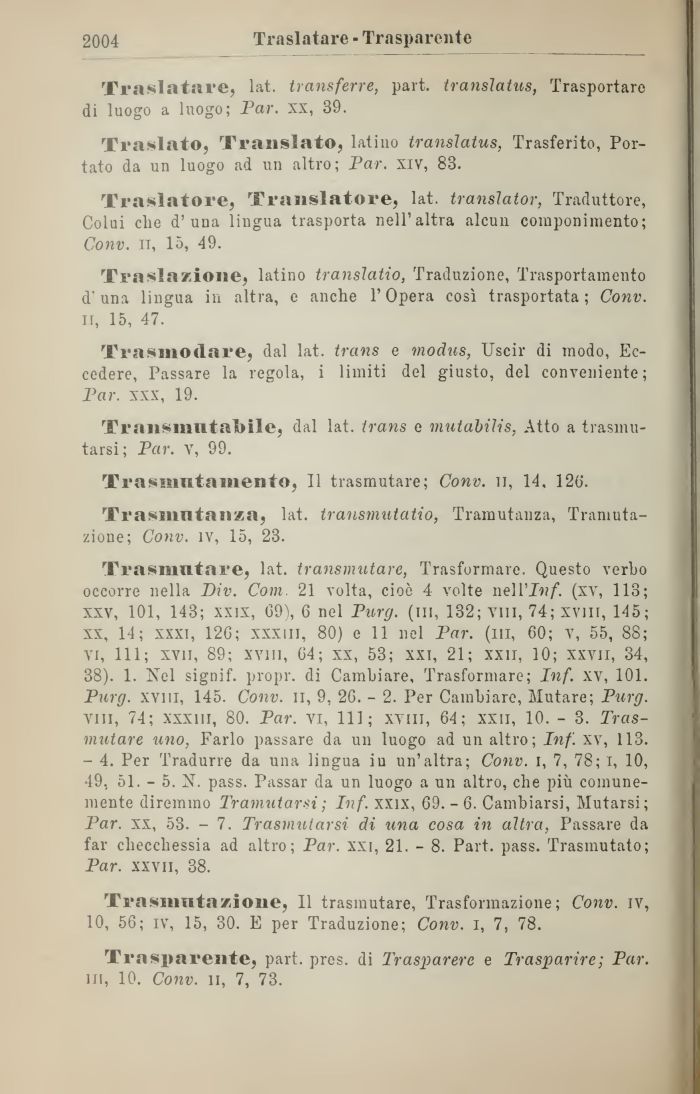 Trasmutazione, Il trasmutare, Trasformazione; Conv. iv, 10, 56; iv, 15, 30. E per Traduzione; Conv. i, 7, 78.