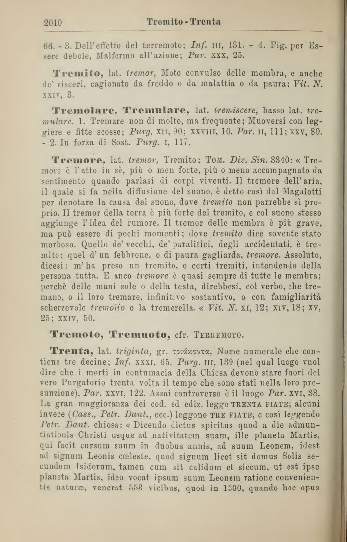 Trenta, lat. triginta, gr. xptoty.ovxa, Nome numerale che contiene tre decine; Inf. xxxi, 65. Purg. ni, 139 (nel qual luogo vuol dire che i morti in contumacia della Chiesa devono stare fuori del vero Purgatorio trenta volta il tempo che sono stati nella loro presunzione), Par. xxvi, 122. Assai controverso è il luogo Par. xvi, 38. La gran maggioranza dei cod. ed ediz. legge trenta fiate; alcuni invece (Cass., Petr. Dant., ecc.) leggono tre fiate, e così leggendo Petr. Dant. chiosa: « Dicendo dictus spiritus quod a die admun-tiationis Christi usque ad nativitatem suam, ille pianeta Martis, qui facit cursum suum in duobus annis, ad suum Leonem, idest ad signum Leonis coeleste, quod signum licet sit domus Solis se-cundum Isidorum, tamen cum sit calidum et siccum, ut est ipse pianeta Martis, ideo vocat ipsum suum Leonem ratione convenien-tis natura, venerat 553 vicibus, quod in 1300, quando hoc opus