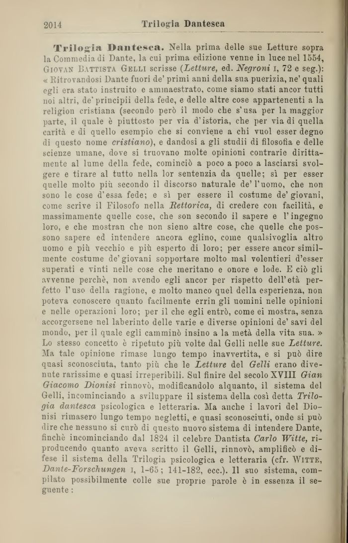 Trilogia Dantesca. Nella prima delle sue Letture sopra la Commedia di Dante, la cui prima edizione venne in luce nel 1554, Giovan Battista Gelli scrisse (Letture, ed. Negroni i, 72 e seg.): « Ritrovandosi Dante fuori de' primi anni della sua puerizia, ne' quali egli era stato instruito e ammaestrato, come siamo stati ancor tutti noi altri, de'principii della fede, e delle altre cose appartenenti a la religion cristiana (secondo però il modo che s'usa per la maggior parte, il quale è piuttosto per via d'istoria, che per via di quella carità e di quello esempio che si conviene a chi vuol esser degno di questo nome cristiano), e dandosi a gli studii di filosofia e delle scienze umane, dove si truovano molte opinioni contrarie dirittamente al lume della fede, cominciò a poco a poco a lasciarsi svolgere e tirare al tutto nella lor sentenzia da quelle; sì per esser quelle molto più secondo il discorso naturale de'l'uomo, che non sono le cose d'essa fede; e sì per essere il costume de'giovani, come scrive il Filosofo nella Bettorica, di credere con facilità, e massimamente quelle cose, che son secondo il sapere e l'ingegno loro, e che mostran che non sieno altre cose, che quelle che possono sapere ed intendere ancora eglino, come qualsivoglia altro uomo e più vecchio e più esperto di loro; per essere ancor similmente costume de'giovani sopportare molto mal volentieri d'esser superati e vinti nelle cose che meritano e onore e lode. E ciò gli avvenne perchè, non avendo egli ancor per rispetto dell'età perfetto l'uso della ragione, e molto manco quel della esperienza, non poteva conoscere quanto facilmente errin gli uomini nelle opinioni e nelle operazioni loro; per il che egli entrò, come ei mostra, senza accorgersene nel laberinto delle varie e diverse opinioni de' savi del mondo, per il quale egli camminò insino a la metà della vita sua. » Lo stesso concetto è ripetuto più volte dal Gelli nelle sue Letture. Ma tale opinione rimase lungo tempo inavvertita, e si può dire quasi sconosciuta, tanto più che le Letture del Gelli erano divenute rarissime e quasi irreperibili. Sul finire del secolo XVIII Gian Giacomo Dionisi rinnovò, modificandolo alquanto, il sistema del Gelli, incominciando a sviluppare il sistema della così detta Trilogia dantesca psicologica e letteraria. Ma anche i lavori del Dionisi rimasero lungo tempo negletti, e quasi sconosciuti, onde si può dire che nessuno si curò di questo nuovo sistema di intendere Dante, finché incominciando dal 1824 il celebre Dantista Carlo Witte, riproducendo quanto aveva scritto il Gelli, rinnovò, amplificò e difese il sistema della Trilogia psicologica e letteraria (cfr. Witte, Dant e- Fo rscli u ngen i, 1-65 ; 141-182, ecc.). 11 suo sistema, compilato possibilmente colle sue proprie parole è in essenza il seguente :