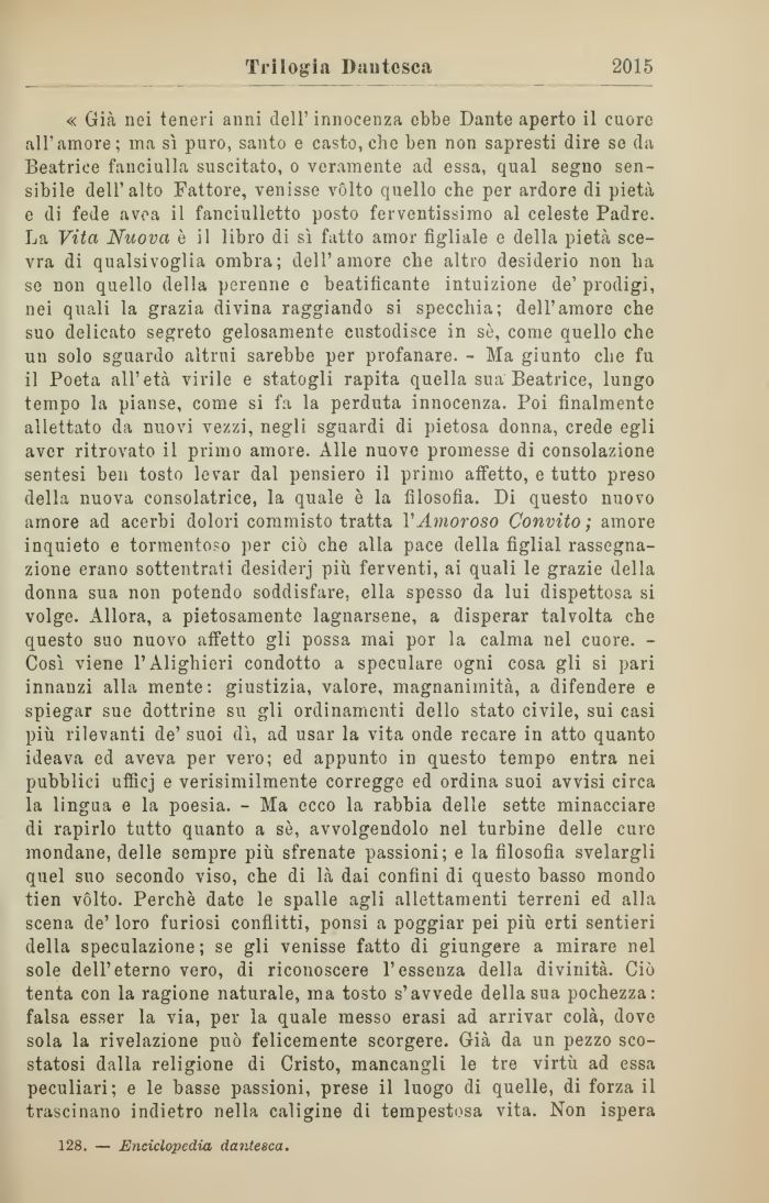 « Già nei teneri anni dell' innocenza ebbe Dante aperto il cuore all'amore; ma sì puro, santo e casto, che ben non sapresti dire se da Beatrice fanciulla suscitato, o veramente ad essa, qual segno sensibile dell'alto Fattore, venisse volto quello che per ardore di pietà e di fede avo a il fanciulletto posto ferventissimo al celeste Padre. La Vita Nuova è il libro di sì fatto amor figliale e della pietà scevra di qualsivoglia ombra; dell'amore che altro desiderio non ha se non quello della perenne e beatificante intuizione de' prodigi, nei quali la grazia divina raggiando si specchia; dell'amore che suo delicato segreto gelosamente custodisce in sè, come quello che un solo sguardo altrui sarebbe per profanare. - Ma giunto che fu il Poeta all'età virile e statogli rapita quella sua Beatrice, lungo tempo la pianse, come si fa la perduta innocenza. Poi finalmente allettato da nuovi vezzi, negli sguardi di pietosa donna, crede egli aver ritrovato il primo amore. Alle nuove promesse di consolazione sentesi ben tosto levar dal pensiero il primo affetto, e tutto preso della nuova consolatrice, la quale è la filosofia. Di questo nuovo amore ad acerbi dolori commisto tratta VAmoroso Convito ; amore inquieto e tormentoso per ciò che alla pace della figliai rassegnazione erano sottentrali desiderj più ferventi, ai quali le grazie della donna sua non potendo soddisfare, ella spesso da lui dispettosa si volge. Allora, a pietosamente lagnarsene, a disperar talvolta che questo suo nuovo affetto gli possa mai por la calma nel cuore. -Così viene l'Alighieri condotto a speculare ogni cosa gli si pari innanzi alla mente: giustizia, valore, magnanimità, a difendere e spiegar sue dottrine su gli ordinamenti dello stato civile, sui casi più rilevanti de' suoi dì, ad usar la vita onde recare in atto quanto ideava ed aveva per vero; ed appunto in questo tempo entra nei pubblici ufficj e verisimilmente corregge ed ordina suoi avvisi circa la lingua e la poesia. - Ma ecco la rabbia delle sette minacciare di rapirlo tutto quanto a sè, avvolgendolo nel turbine delle curo mondane, delle sempre più sfrenate passioni; e la filosofia svelargli quel suo secondo viso, che di là dai confini di questo basso mondo tien volto. Perchè date le spalle agli allettamenti terreni ed alla scena de' loro furiosi conflitti, ponsi a poggiar pei più erti sentieri della speculazione; se gli venisse fatto di giungere a mirare nel sole dell'eterno vero, di riconoscere l'essenza della divinità. Ciò tenta con la ragione naturale, ma tosto s'avvede della sua pochezza: falsa esser la via, per la quale messo erasi ad arrivar colà, dove sola la rivelazione può felicemente scorgere. Già da un pezzo scostatosi dalla religione di Cristo, mancangli le tre virtù ad essa peculiari; e le basse passioni, prese il luogo di quelle, di forza il trascinano indietro nella caligine di tempestosa vita. Non ispera