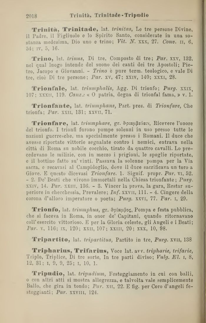 Trionfo, lat. triumphus, gr. -9-pca;jtpog, Pompa e festa pubblica, che si faceva in Roma, in onor de' Capitani, quando ritornavano coli'esercito vittorioso. E per la Gloria celeste, gli Angeli e i Beati; Par. v, 116; ix, 120; xxn, 107; xxm, 20; XXX, 10, 98.