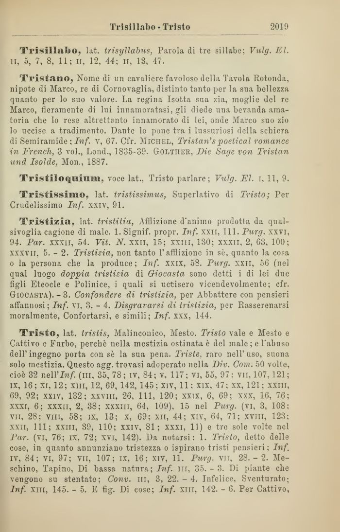 Tristo, lat. tristis, Malinconico, Mesto. Tristo vale e Mesto e Cattivo e Furbo, perchè nella mestizia ostinata è del male ; e l'abuso dell' ingegno porta con sè la sua pena. Triste, raro nell' uso, suona solo mestizia. Questo agg. trovasi adoperato nella Div. Com. 50 volte, cioè 32 neWInf. (ni, 35, 78; iv, 84; v, 117; vi, 55, 97; vii, 107, 121; ix, 16; xi, 12; xin, 12, 69, 142, 145; xiv, 11; xix, 47; xx, 121; xxm, 69, 92; xxiv, 132; xxvm, 26, 111, 120; xxix, 6, 69; xxx, 16, 76; xxxr, 6; xxxn, 2, 38; xxxiii, 64, 109), 15 nel Purg. (vi, 3, 108; vir, 28; vili, 58; ix, 13; x, 69; xn, 44; xiv, 64, 71; xvin, 123; xxii, 111; xxm, 39, 110; xxiv, 81; xxxi, 11) e tre sole volte nel Par. (vi, 76; ix, 72; xvi, 142). Da notarsi: 1. Tristo, detto delle cose, in quanto annunziano tristezza o ispirano tristi pensieri; Inf. iv, 84; vi, 97; vii, 107; ix, 16; xiv, 11. Purg. vii, 28.- 2. Meschino, Tapino, Di bassa natura; Inf. Ili, 35.-3. Di piante che vengono su stentate; Conv. ni, 3, 22.-4. Infelice, Sventurato; Inf. xiii, 145. - 5. E fig. Di cose; Inf. xiii, 142. - 6. Per Cattivo,