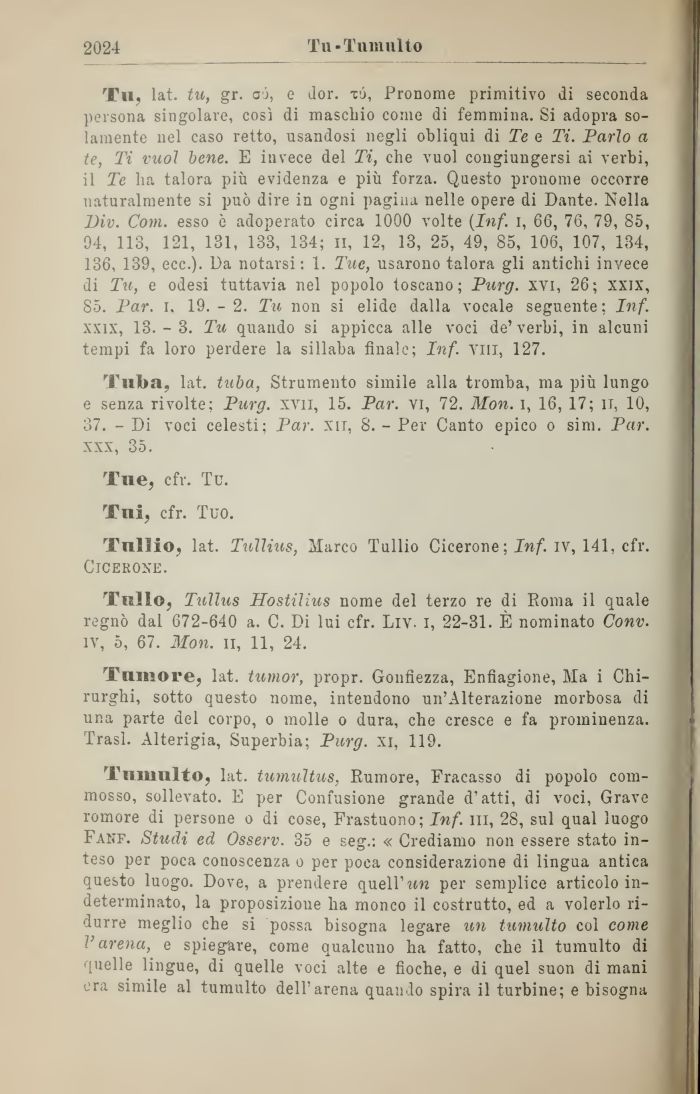 Tu, lat. tu, gr. aò, e dor. tu, Pronome primitivo di seconda persona singolare, così di maschio come di femmina. Si adopra solamente nel caso retto, usandosi negli obliqui di Te e Ti. Parlo a te, Ti vuol bene. E invece del Ti, che vuol congiungersi ai verbi, il Te ha talora più evidenza e più forza. Questo pronome occorre naturalmente si può dire in ogni pagina nelle opere di Dante. Nella Div. Com. esso ò adoperato circa 1000 volte (Inf. i, 66, 76, 79, 85, 94, 113, 121, 131, 133, 134; n, 12, 13, 25, 49, 85, 106, 107, 134, 136, 139, ecc.). Da notarsi: 1. Tue, usarono talora gli antichi invece di Tu, e odesi tuttavia nel popolo toscano; Purg. xvi, 26; xxix, 85. Par. i. 19. - 2. Tu non si elide dalla vocale seguente; Inf.