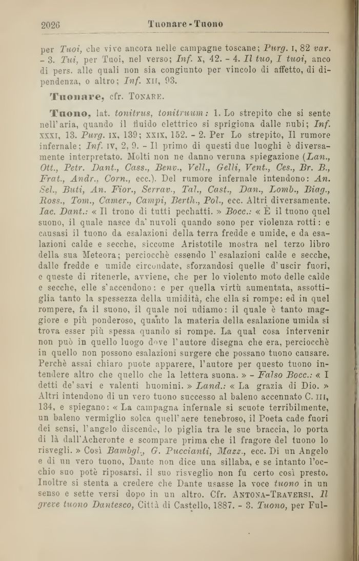 Tnono, lat. tonitrus, tonitruum : 1. Lo strepito che si sente nell'aria, quando il fluido elettrico si sprigiona dalle nubi; Inf. xxxi, 13. Purg. ix, 139; xxix, 152. - 2. Per Lo strepito, Il rumore infernale; Inf. iv, 2. 9. - Il primo di questi due luoghi è diversamente interpretato. Molti non ne danno veruna spiegazione (Lan., Ott., Petr. Dant., Cass., Benv., Veli., Gelli, Vent., Ces., Br. B., Frat., Art dr.. Corn., ecc.). Del rumore infernale intendono: An. Sei., Buti, An. Fior., Serrav., Tal., Cast.., Dan., Lomb., Biag., Ross., Tom., Carrier., Campi, Berth., Poi., ecc. Altri diversamente. Iac. Dant.: « Il trono di tutti pechatti. » Bocc.: « E il tuono quel suono, il quale nasce da' nuvoli quando sono per violenza rotti : e causasi il tuono da esalazioni della terra fredde e umide, e da esalazioni calde e secche, siccome Aristotile mostra nel terzo libro della sua Meteora; perciocché essendo l'esalazioni calde e secche, dalle fredde e umide circondate, sforzandosi quelle d'uscir fuori, e queste di ritenerle, avviene, che per lo violento moto delle calde e secche, elle s'accendono: e per quella virtù aumentata, assottiglia tanto la spessezza della umidità, che ella si rompe: ed in quel rompere, fa il suono, il quale noi udiamo: il quale è tanto maggiore e più ponderoso, quanto la materia della esalazione umida si trova esser più spessa quando si rompe. La qual cosa intervenir non può in quello luogo dove l'autore disegna che era, perciocché in quello non possono esalazioni surgere che possano tuono causare. Perchè assai chiaro puote apparere, l'autore per questo tuono intendere altro che quello che la lettera suona. » - Falso Bocc.: « I detti de' savi e valenti huomini. » Land.: « La grazia di Dio. » Altri intendono di un vero tuono successo al baleno accennato C. ili, 134, e spiegano: «La campagna infernale si scuote terribilmente, un baleno vermiglio solca quell'aere tenebroso, il Poeta cade fuori dei sensi, l'angelo discende, lo piglia tra le sue braccia, lo porta di là dall'Acheronte e scompare prima che il fragore del tuono lo risvegli. » Così BambgL, G. Puccianti, Mass., ecc. Di un Angelo e di un vero tuono, Dante non dice una sillaba, e se intanto l'occhio suo potè riposarsi, il suo risveglio non fu certo così presto. Inoltre si stenta a credere che Dante usasse la voce tuono in un senso e sette versi dopo in un altro. Cfr. Antona-Traversi, il greve tuono Dantesco, Città di Castello, 1887. - 3. Tuono, per Fui-