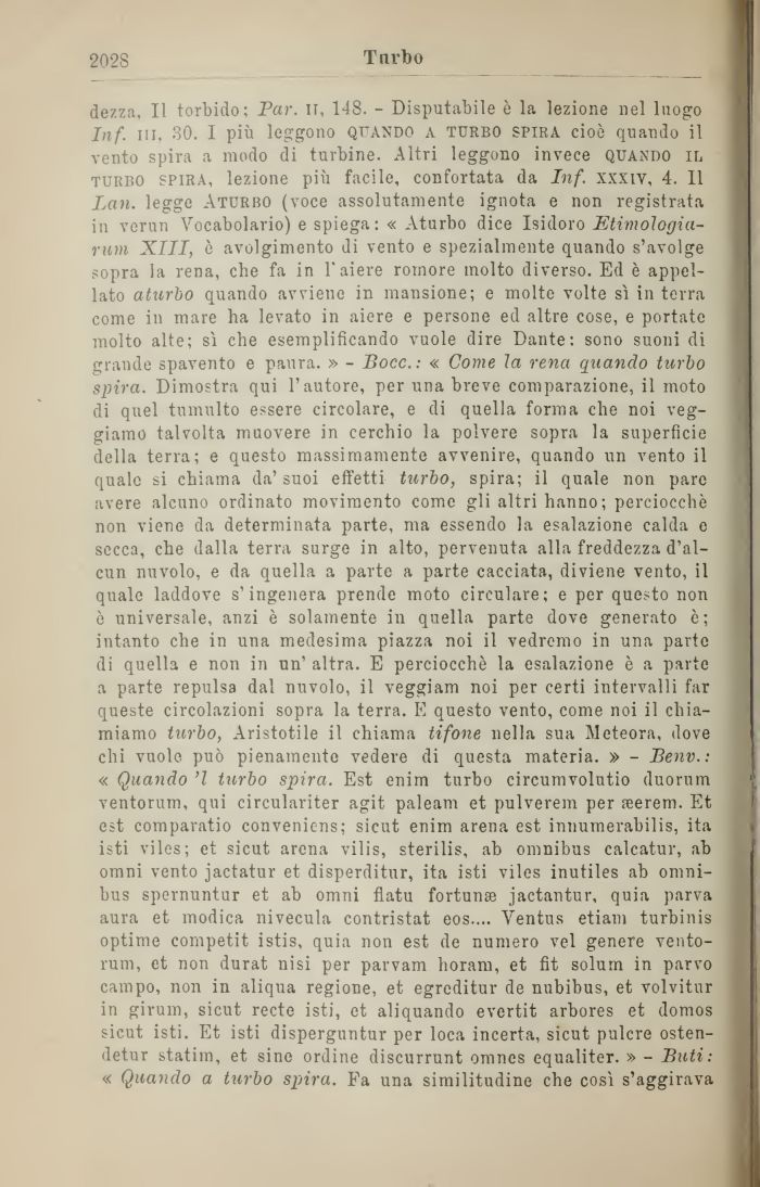 dezza. Il torbido; Par. il, 148. - Disputabile è la lezione nel luogo Inf. in, 30. I più leggono quando a turbo spira cioè quando il vento spira a modo di turbine. Altri leggono invece quando il turbo spira, lezione più facile, confortata da Inf. xxxiv, 4. Il Lan. legge Aturbo (voce assolutamente ignota e non registrata in verun Vocabolario) e spiega: « Aturbo dice Isidoro Etimologia-rum XIII, è avolgimento di vento e spezialmente quando s'avolge sopra la rena, che fa in l'aiere romore molto diverso. Ed è appellato aturbo quando avviene in mansione; e molte volte sì in terra come in mare ha levato in aiere e persone ed altre cose, e portate molto alte; sì che esemplificando vuole dire Dante: sono suoni di grande spavento e paura. » - Bocc.: « Come la rena quando turbo spira. Dimostra qui l'autore, per una breve comparazione, il moto di quel tumulto essere circolare, e di quella forma che noi veg-giamo talvolta muovere in cerchio la polvere sopra la superficie della terra; e questo massimamente avvenire, quando un vento il quale si chiama da' suoi effetti turbo, spira; il quale non pare avere alcuno ordinato movimento come gli altri hanno; perciocché non viene da determinata parte, ma essendo la esalazione calda e secca, che dalla terra surge in alto, pervenuta alla freddezza d'alcun nuvolo, e da quella a parte a parte cacciata, diviene vento, il quale laddove s'ingenera prende moto circulare; e per questo non è universale, anzi è solamente in quella parte dove generato è; intanto che in una medesima piazza noi il vedremo in una parte di quella e non in un' altra. E perciocché la esalazione è a parte a parte repulsa dal nuvolo, il veggiam noi per certi intervalli far queste circolazioni sopra la terra. E questo vento, come noi il chiamiamo turbo, Aristotile il chiama tifone nella sua Meteora, dove chi vuole può pienamente vedere di questa materia. » - Benv.: « Quando 'l turbo spira. Est enim turbo circumvolutio duorum ventorum, qui circulariter agit paleam et pulverem per feerem. Et est comparatio conveniens; sicut enim arena est innumerabilis, ita isti viles; et sicut arena vilis, sterilis, ab omnibus calcatur, ab omni vento jactatur et disperditur, ita isti viles inutiles ab omnibus spernuntur et ab omni flatu fortunse jactantur, quia parva aura et modica nivecula contristat eos.... Ventus etiam turbinis optime competit istis, quia non est de numero vel genere vento-rum, et non durat nisi per parvam horam, et fit solum in parvo campo, non in aliqua regione, et egreditur de nubibus, et volvitur in girum, sicut recte isti, et aliquando evertit arbores et domos sicut isti. Et isti disperguntur per loca incerta, sicut pulcre osten-detur statim, et sine ordine discurrunt omnes equaliter. » - Buti: « Quando a turbo spira. Fa una similitudine che così s'aggirava