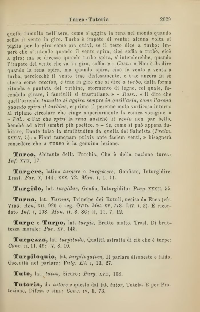 Turno, lat. Turnus, Principe dei Rutuli, ucciso da Enea (cfr. Virg. Aevi, xir, 926 e seg. Oyid. Met. xv, 773. Liv. i, 2). È ricordato Inf. i, 108. Mon. ir, 3, 86; n, 11, 7, 12.