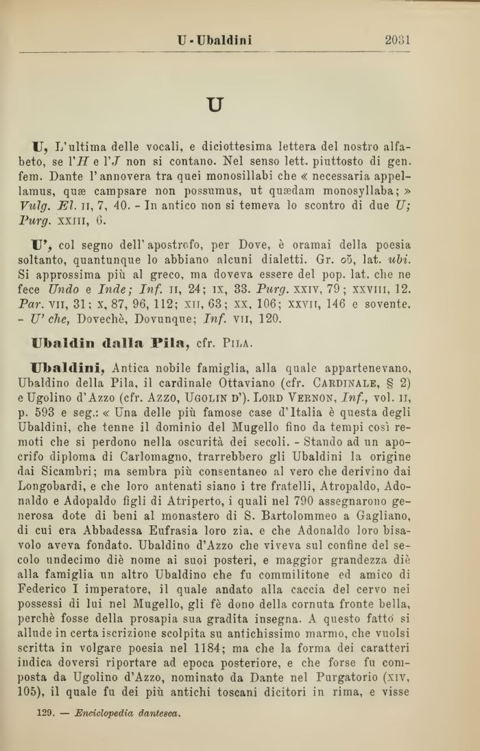 Ubaldini, Antica nobile famiglia, alla quale appartenevano, Ubaldino della Pila, il cardinale Ottaviano (cfr. Cardinale, § 2) e Ugolino d'Azzo (cfr. Azzo, Ugolin d'). Lord Yernon, Inf., voi. n, p. 593 e seg.: « Una delle più famose case d'Italia è questa degli Ubaldini, che tenne il dominio del Mugello fino da tempi così remoti che si perdono nella oscurità dei secoli. - Stando ad un apocrifo diploma di Carlomagno, trarrebbero gli Ubaldini la origine dai Sicambri; ma sembra più consentaneo al vero che derivino dai Longobardi, e che loro antenati siano i tre fratelli, Atropaldo, Ado-naldo e Adopaldo figli di Atriperto, i quali nel 790 assegnarono generosa dote di beni al monastero di S. Bartolommeo a Gagliano, di cui era Abbadessa Eufrasia loro zia, e che Adonaldo loro bisavolo aveva fondato. Ubaldino d'Azzo che viveva sul confine del secolo undecimo diè nome ai suoi posteri, e maggior grandezza die alla famiglia un altro Ubaldino che fu commilitone ed amico di Federico I imperatore, il quale andato alla caccia del cervo nei possessi di lui nel Mugello, gli fè dono della cornuta fronte bella, perchè fosse della prosapia sua gradita insegna. A questo fatto si allude in certa iscrizione scolpita su antichissimo marmo, che vuoisi scritta in volgare poesia nel 1184; ma che la forma dei caratteri indica doversi riportare ad epoca posteriore, e che forse fu composta da Ugolino d'Azzo, nominato da Dante nel Purgatorio (xiv, 105), il quale fu dei più antichi toscani dicitori in rima, e visse