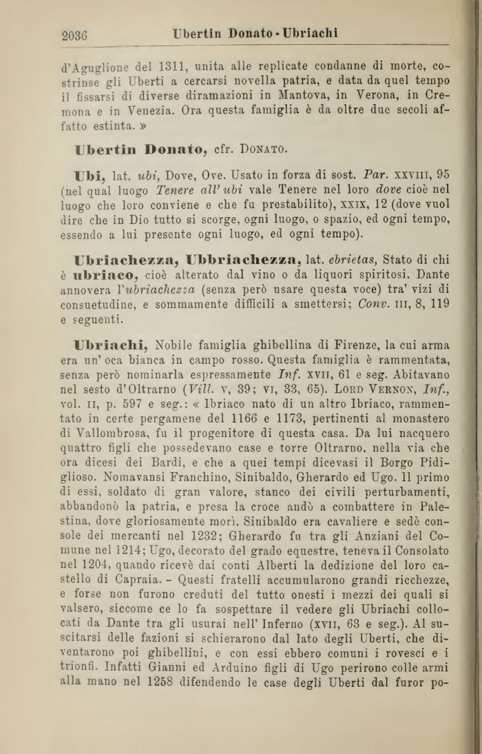 Ubriachi, Nobile famiglia ghibellina di Firenze, la cui arma era un' oca bianca in campo rosso. Questa famiglia è rammentata, senza però nominarla espressamente Inf. xvn, 61 e seg. Abitavano nel sesto d'Oltrarno (Vili. v, 39; vi, 33, 65). Lord Vernon, Inf., voi. il, p. 597 e seg.: « Ibriaco nato di un altro Ibriaco, rammentato in certe pergamene del 1166 e 1173, pertinenti al monastero di Vallombrosa, fu il progenitore di questa casa. Da lui nacquero quattro figli che possedevano case e torre Oltrarno, nella via che ora dicesi dei Bardi, e che a quei tempi dicevasi il Borgo Pidi-glioso. Nomavansi Franchino, Sinibaldo, Gherardo ed Ugo. 11 primo di essi, soldato di gran valore, stanco dei civili perturbamenti, abbandonò la patria, e presa la croce andò a combattere in Palestina, dove gloriosamente morì. Sinibaldo era cavaliere e sedè console dei mercanti nel 1232; Gherardo fu tra gli Anziani del Comune nel 1214; Ugo, decorato del grado equestre, teneva il Consolato nel 1204, quando ricevè dai conti Alberti la dedizione del loro castello di Capraia. - Questi fratelli accumularono grandi ricchezze, e forse non furono creduti del tutto onesti i mezzi dei quali si valsero, siccome ce lo fa sospettare il vedere gli Ubriachi collocati da Dante tra gli usurai nell' Inferno (xvii, 63 e seg.). Al suscitarsi delle fazioni si schierarono dal lato degli Uberti, che diventarono poi ghibellini, e con essi ebbero comuni i rovesci e i trionfi. Infatti Gianni ed Arduino figli di Ugo perirono colle armi alla mano nel 1258 difendendo le case degli Uberti dal furor po-