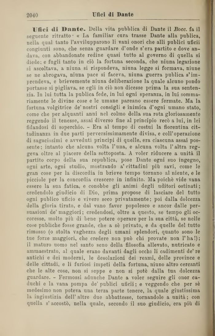 Ufici «li Dante. Della vita pubblica di Dante il Bocc. fa il seguente ritratto ¦ « La familiar cura trasse Dante alla publica, nella qual tanto l'avvilupparono li vani onori che alli publici uficii congiunti sono, che senza guardare d'onde s'era partito e dove andava, con abbandonate redine quasi tutto al governo di quella si diede; e fugli tanto in ciò la fortuna seconda, che niuna legazione si ascoltava, a niuna si rispondeva, niuna legge si formava, niune se ne abrogava, niuna pace si faceva, niuna guerra publica s'imprendeva, e brievemente niuna deliberazione la quale alcuno pondo portasse si pigliava, se egli in ciò non dicesse prima la sua sentenzia. In lui tutta la publica fede, in lui ogni speranza, in lui sommariamente le divine cose e le umane pareano essere fermate. Ma la fortuna volgitrice de'nostri consigli e inimica d'ogni umano stato, come che per alquanti anni nel colmo della sua rota gloriosamente reggendo il tenesse, assai diverso fine al principio recò a lui, in lei fidandosi di soperchio. - Era al tempo di costui la fiorentina cittadinanza in due parti perversissimamente divisa, e coli'operazione di sagacissimi e avveduti principi di quelle, era ciascuna assai possente; intanto che alcuna volta l'una, e alcuna volta l'altra reggeva oltre al piacere della sottoposta. A voler riducere a unità il partito corpo della sua republica, pose Dante ogni suo ingegno, ogni arte, ogni studio, mostrando a' cittadini più savi, come le gran cose per la discordia in brieve tempo tornano al niente, e le picciole per la concordia crescere in infinito. Ma poiché vide vana essere la sua fatica, e conobbe gli animi degli uditori ostinati ; credendolo giudicio di Dio, prima propose di lasciare del tutto ogni publico uficio e vivere seco privatamente; poi dalla dolcezza della gloria tirato, e dal vano favor popolesco e ancor dalle persuasioni de'maggiori; credendosi, oltre a questo, se tempo gli oc-coresse, molto più di bene potere operare per la sua città, se nelle cose publiche fosse grande, che a sè privato, e da quelle del tutto rimosso (o stolta vaghezza degli umani splendori, quanto sono le tue forze maggiori, che credere non può chi provate non l'ha!); il maturo uomo nel santo seno della filosofia allevato, nutricato e ammaestrato, al quale erano davanti dagli occhi li cadimenti de' re antichi e dei moderni, le desolazioni dei reami, delle province e delle cittadi, e li furiosi impeti della fortuna, niuno altro cercanti che le alte cose, non si seppe e non si potè dalla tua dolcezza guardare. - Fermossi adunche Dante a voler seguire gli onor caduchi e la vana pompa de' publici uficii ; e veggendo che per sè medesimo non poteva una terza parte tenere, la quale giustissima la ingiustizia dell'altre due abbattesse, tornandole a unità; con quella s' accostò, nella quale, secondo il suo giudicio, era più di