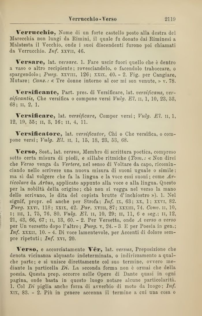 Verso, Sost., lat. versus, Membro di scrittura poetica, compreso sotto certa misura di piedi, e sillabe ritmiche (Tom. : «Non direi che Verso venga da Vertere, nel senso di Voltare da capo, ricominciando nello scrivere una nuova misura di suoni uguale o simile : ma sì dal volgere che fa la lingua e la voce essi suoni; come Articolare da Artus, applicato appunto alla voce e alla lingua. Questo per la nobiltà della origine ; chè non si vegga nel verso la mano dello scrivano, le dita del copista brutte d'inchiostro »). 1. Nel signif, propr. ed anche per Strofa; Inf. ix, 63; xx, 1; xxvi, 82. Purg. xxvi, 118; xxix, 42. Par. xvm, 87; xxxiii, 74. Conv. li, 10, i; in, 1, 75, 76, 80. Vulg. Eh n, 10, 29; il, 11, 6 e seg.; li, 12, 21, 43, 66, 67; il, 13, 60. - 2. Per Versetto, onde A verso a verso per Un versetto dopo l'altro; Purg. v, 24. - 3. E per Poesia in gen.; Inf. xxxii, 10. - 4. Di voce lamentevole, per Accenti di dolore sempre ripetuti; Inf. xvi, 20.