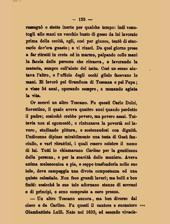— Un altro Toscano ancora, ma ben diverso dal cieco e da Carlino. Fu questi il cantore e suonatore Giambattista LullL Nato nel 1633, ed essendo vivacis-